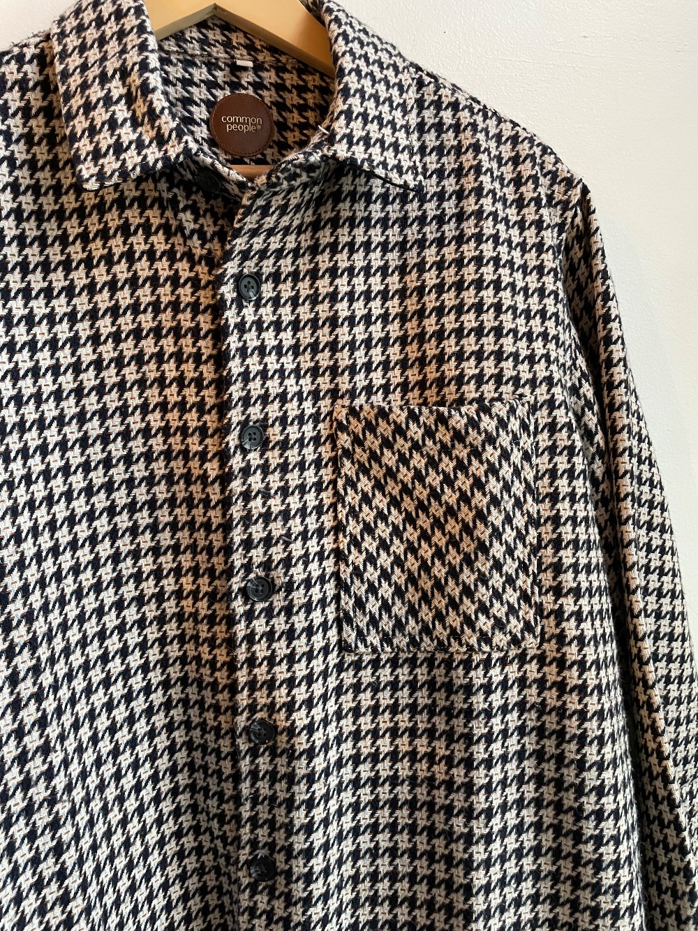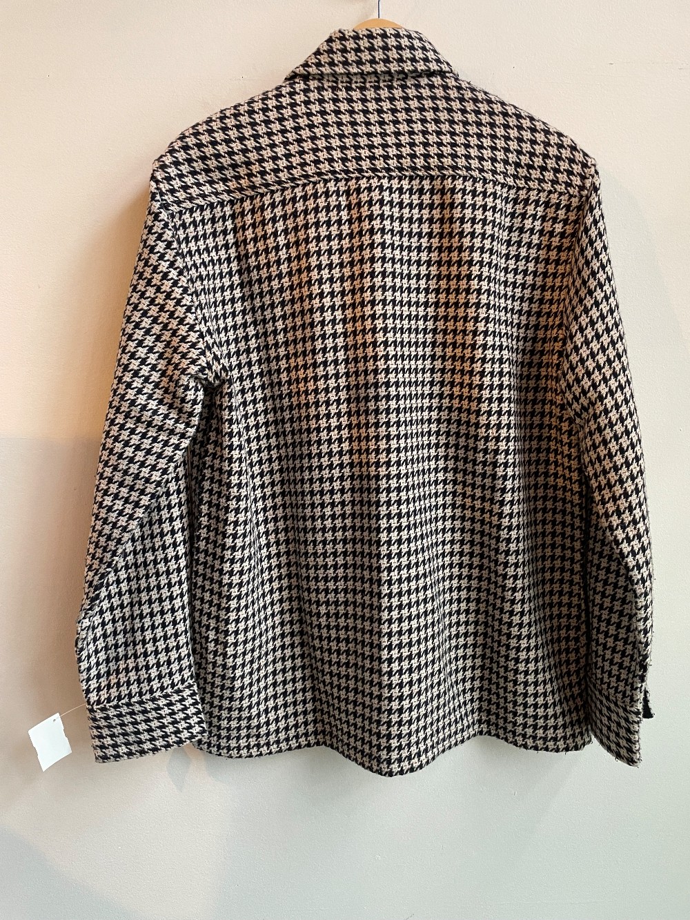 Mens sizing! A woven style shirt jacket with navy and white check print. Made from a heavy material, has a button front and front pockets. Fabric is a poly/ acrylic/ nylon/ wool blend