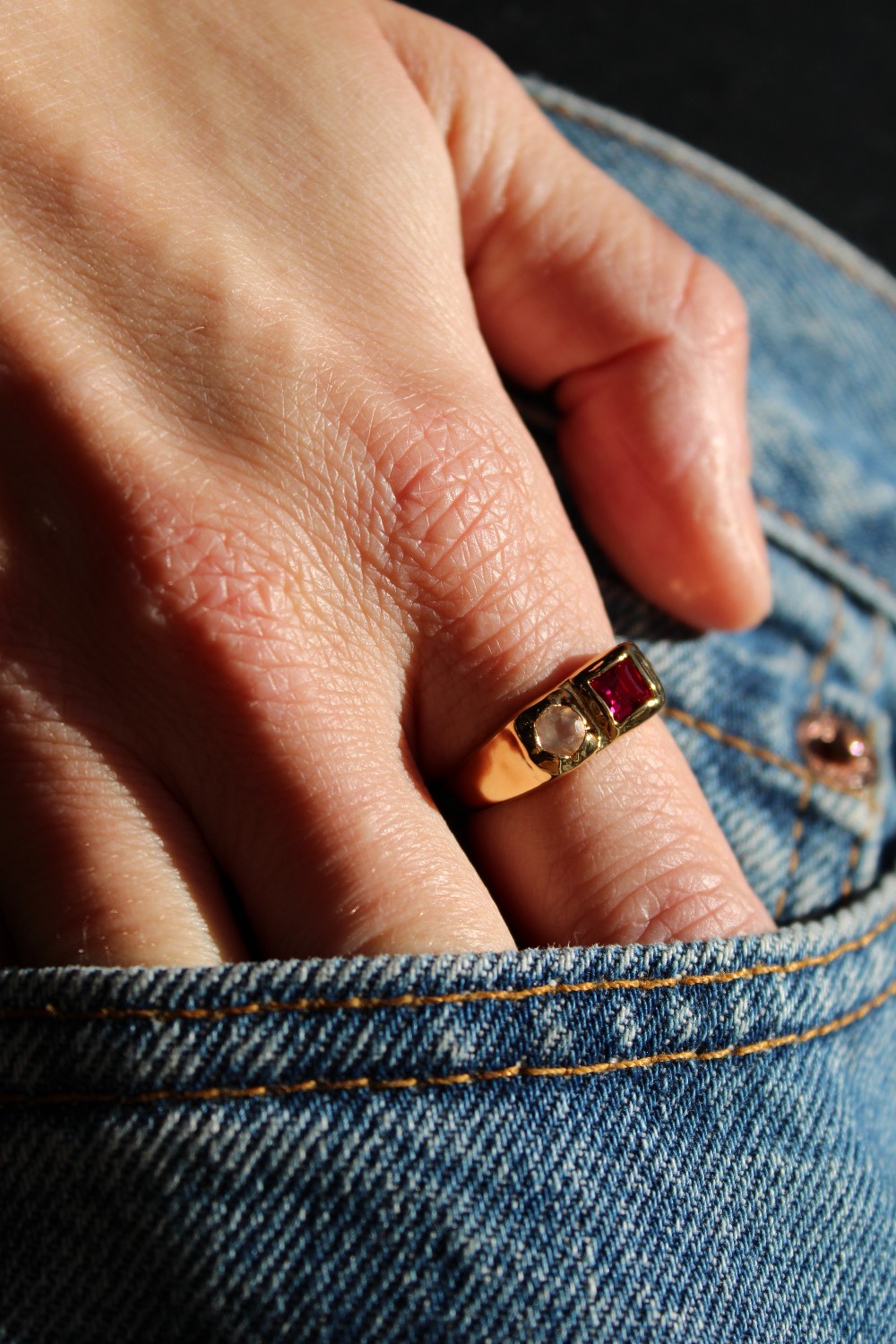 Mid-sized ring Genuine pink Quartz and lab-created red Ruby gemstones 14k Gold plated recycled brass https://www.wolfcircus.com/products/bryce-ring-in-gold?_pos=3&_sid=41564c12c&_ss=r