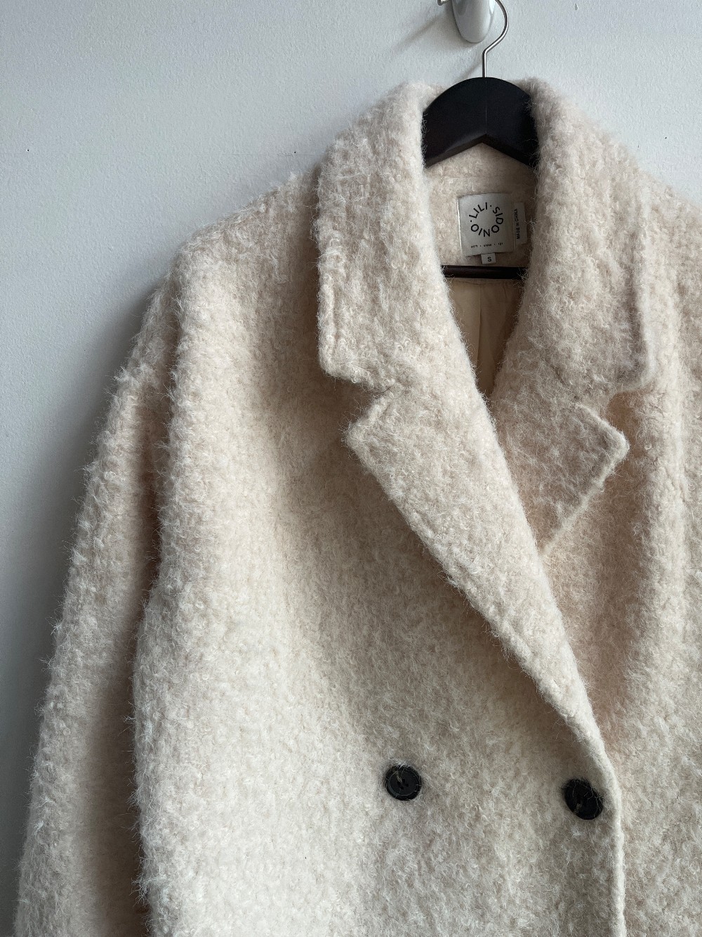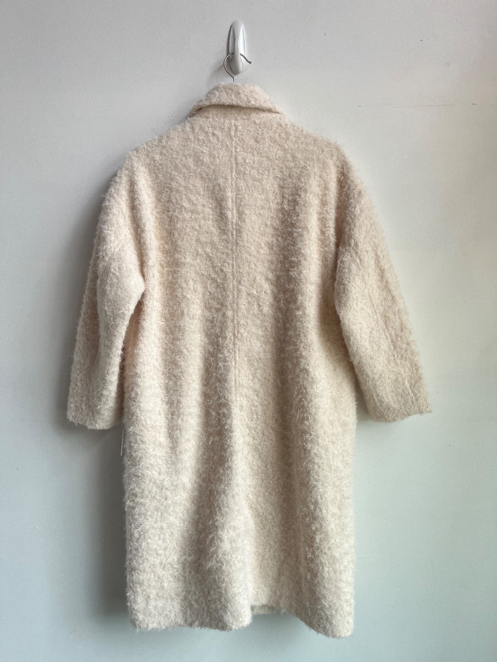 Stunning straight silhouette long sheep skin effect coat with full length sleeves, a tailored collar and double-breasted button closure with side seam pockets.