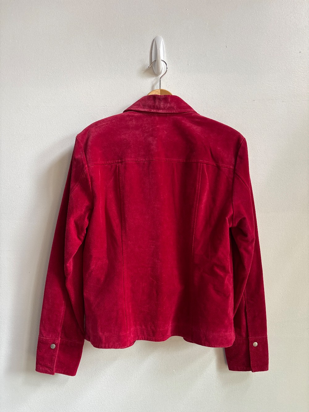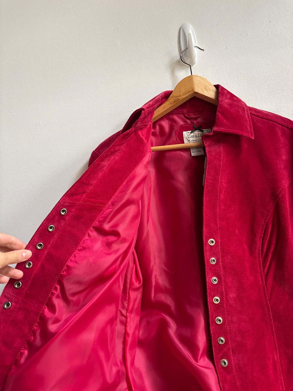 A lovely fitted suede jacket with a button up front, tapered waist, side pockets, collar and inner lining. Perfect statement piece for any outfit.