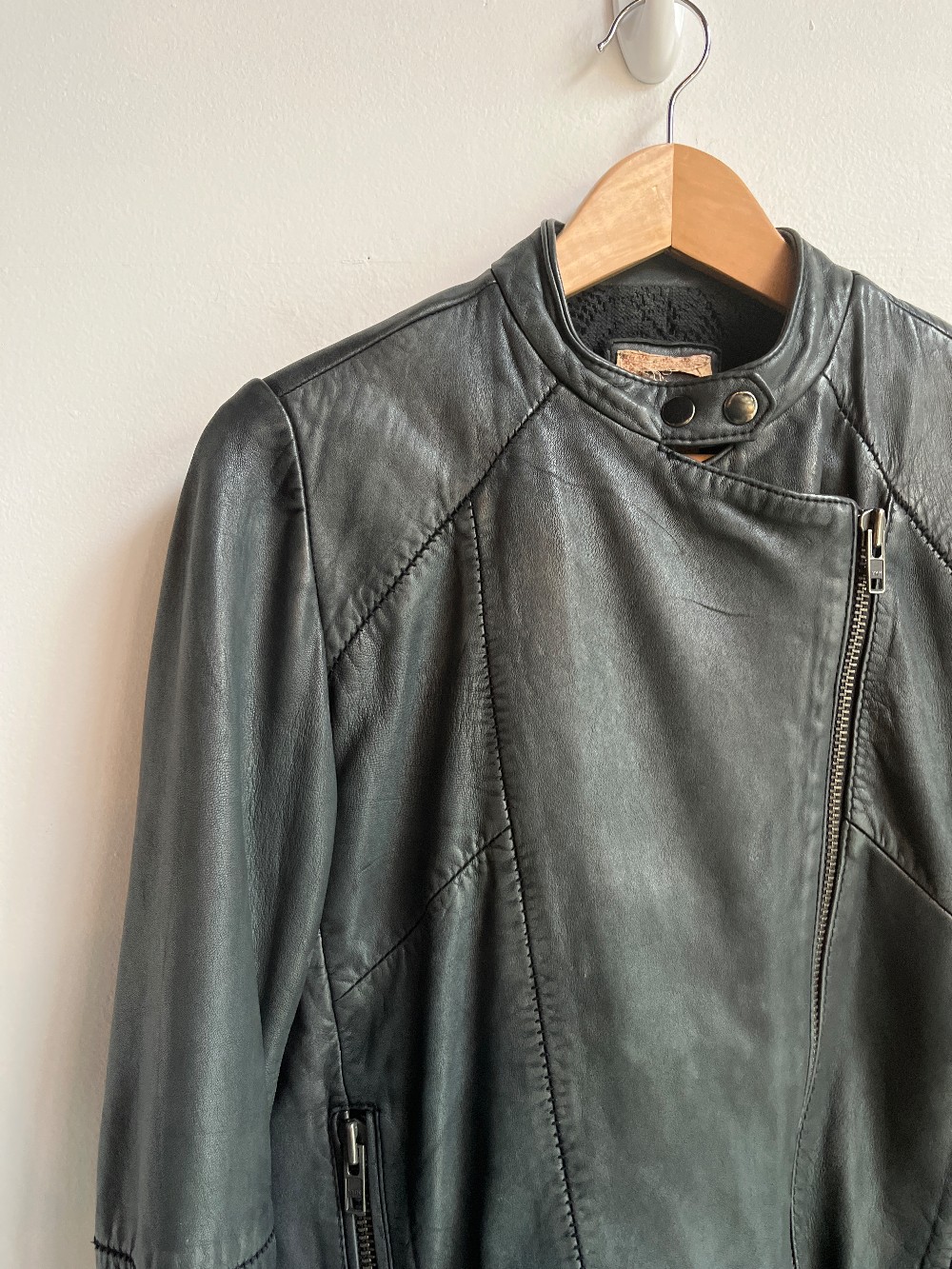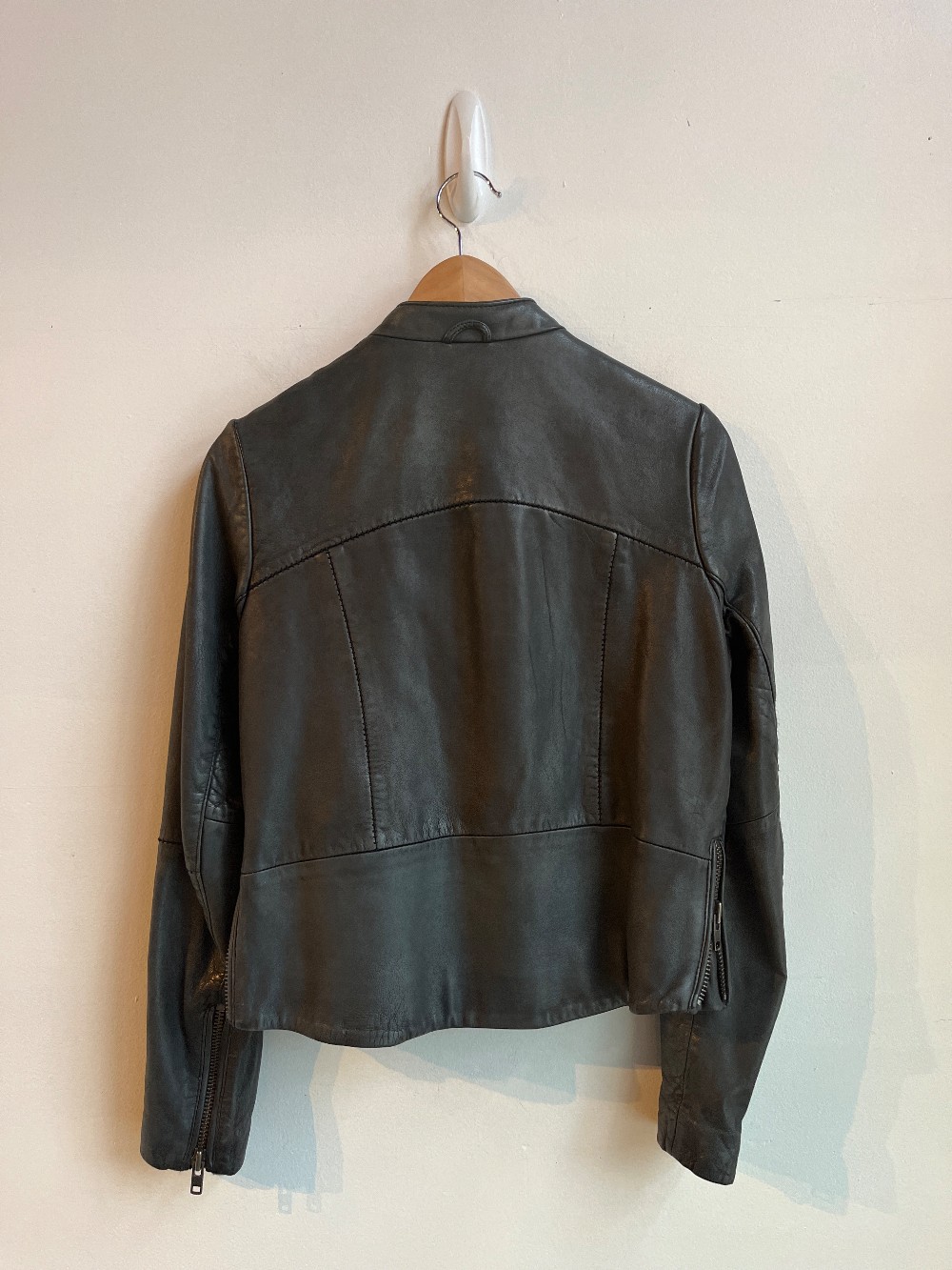 Stunning soft lamb leather jacket in a fitted moto silhouette. Has a full zip front closure, with a snap close collar. Two front zip close pockets and a lace inner liner.