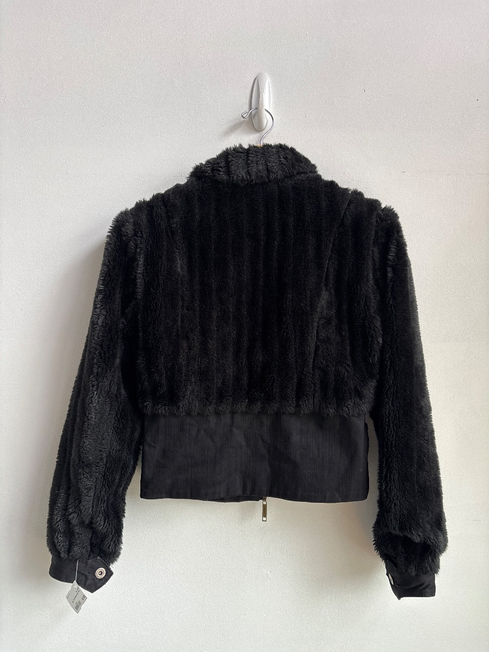Fits smaller! The most 2000s styled jacket that you can find! Features a cinched waist, zip front, fuzzy outer, houndstooth satin inner and decorative strap details.