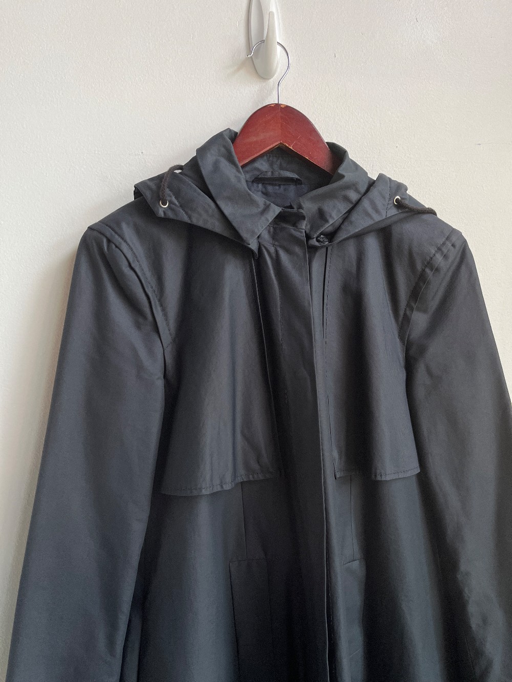 A long trench styled jacket with a removable hood, drawstrings, side pockets, a button up front, inner lining and drawstring hem