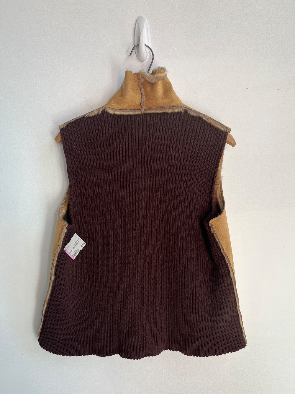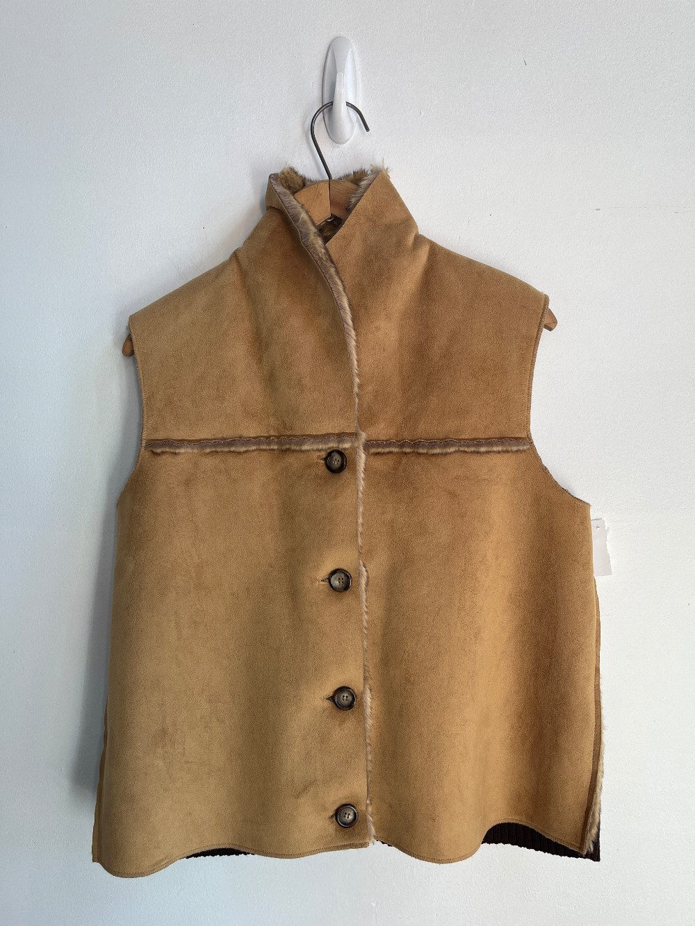 A cozy vest, perfect to layer on in fall! Features a fold over faux fur trim, button up front, faux suede front and ribbed knit cotton back.