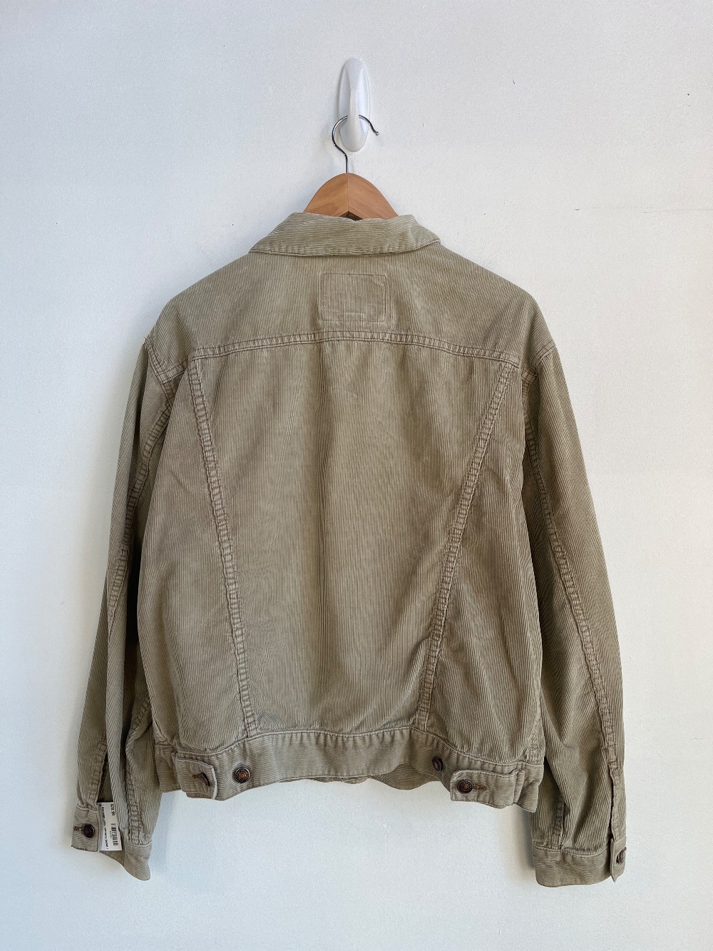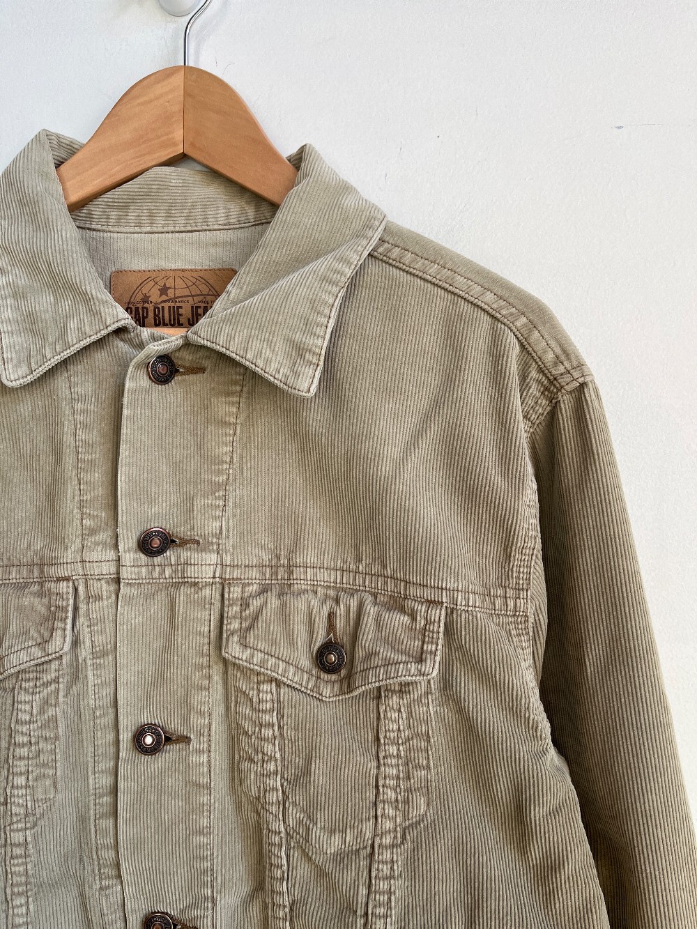 A soft sage green corduroy trucker jacket with a full button down front, 4 pockets, and a pointed collar. Features a belted bottom waist hem for a cinched look.