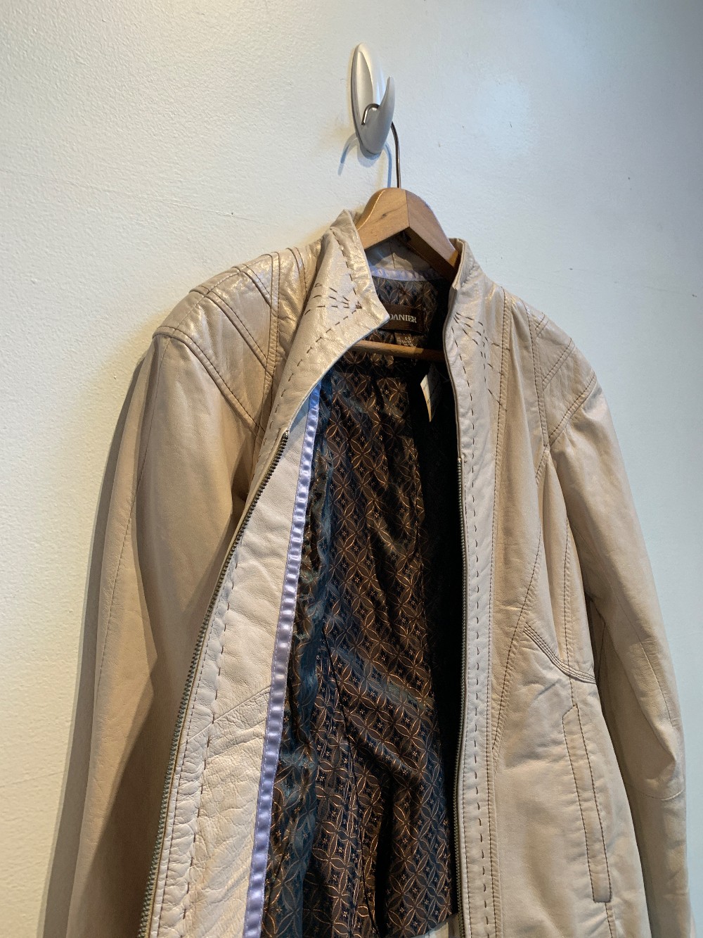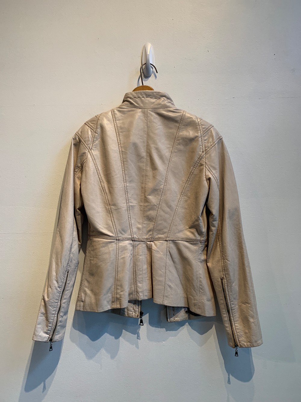 As Is: small marks in leather. A fun, cream leather jacket with brown threading. Features a zip front, two pockets, and a diamond patterned inner lining.