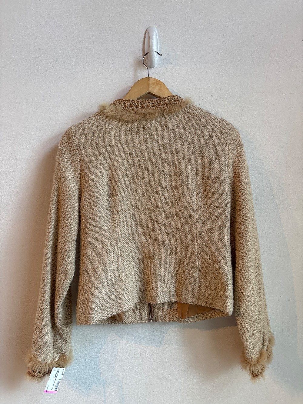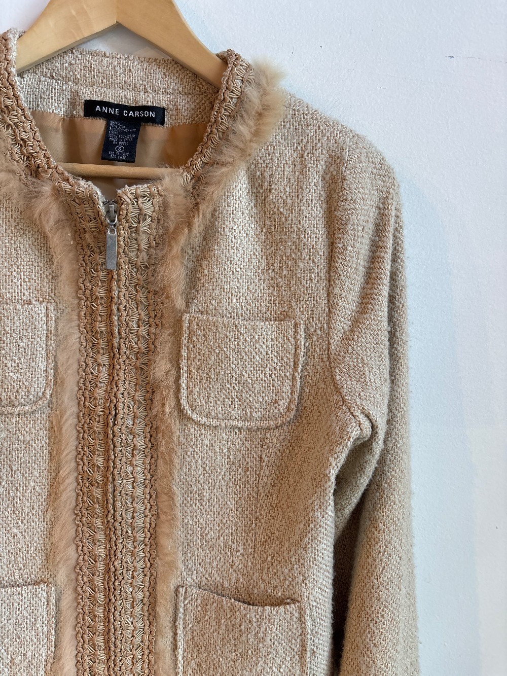Stunning beige coloured zip front jacket with a high round neckline, fur trim detailing and woven accents on either side of zip front. Has 4 front patch style pockets