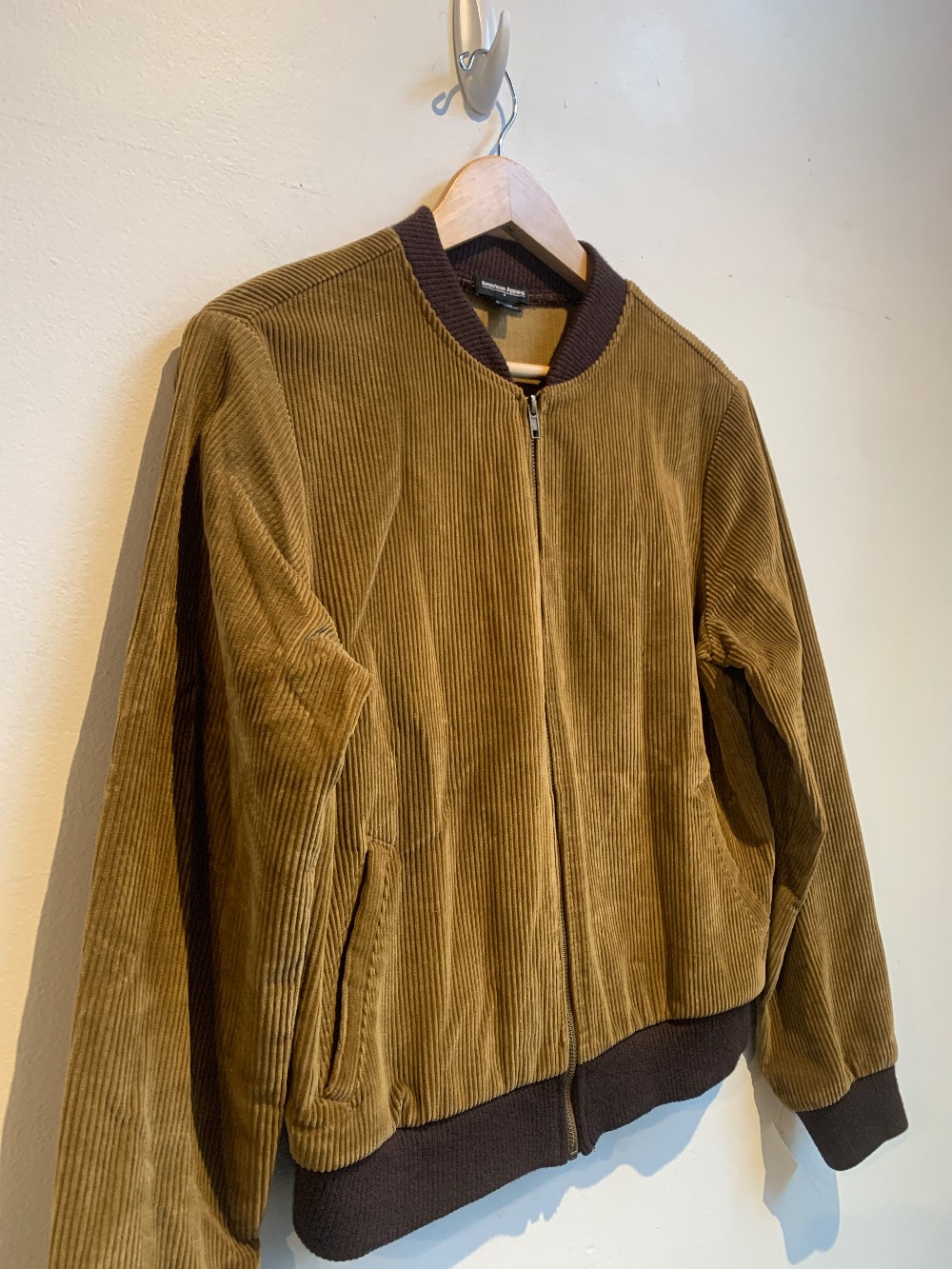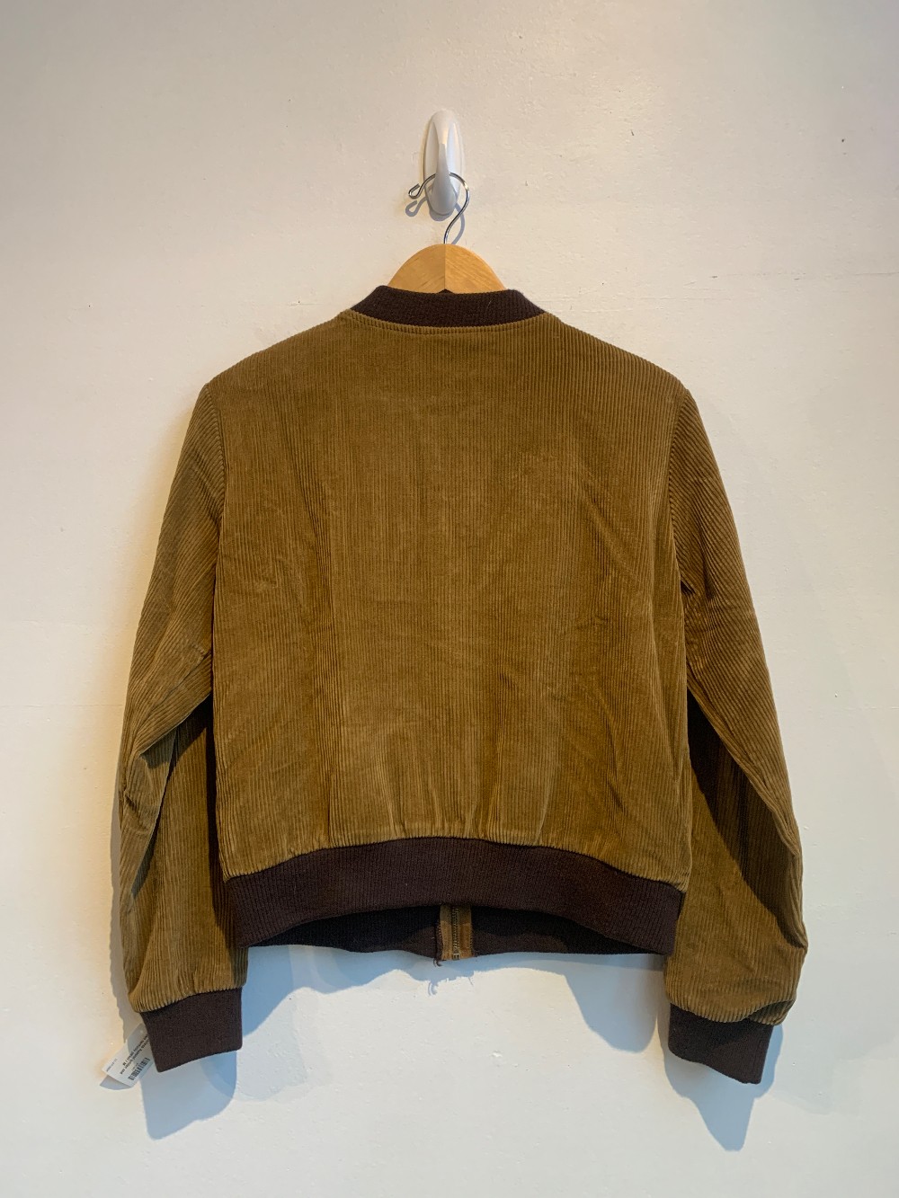 A soft corduroy jacket with a golden and brown hemmed colour way. Features a zip down front and two pockets.