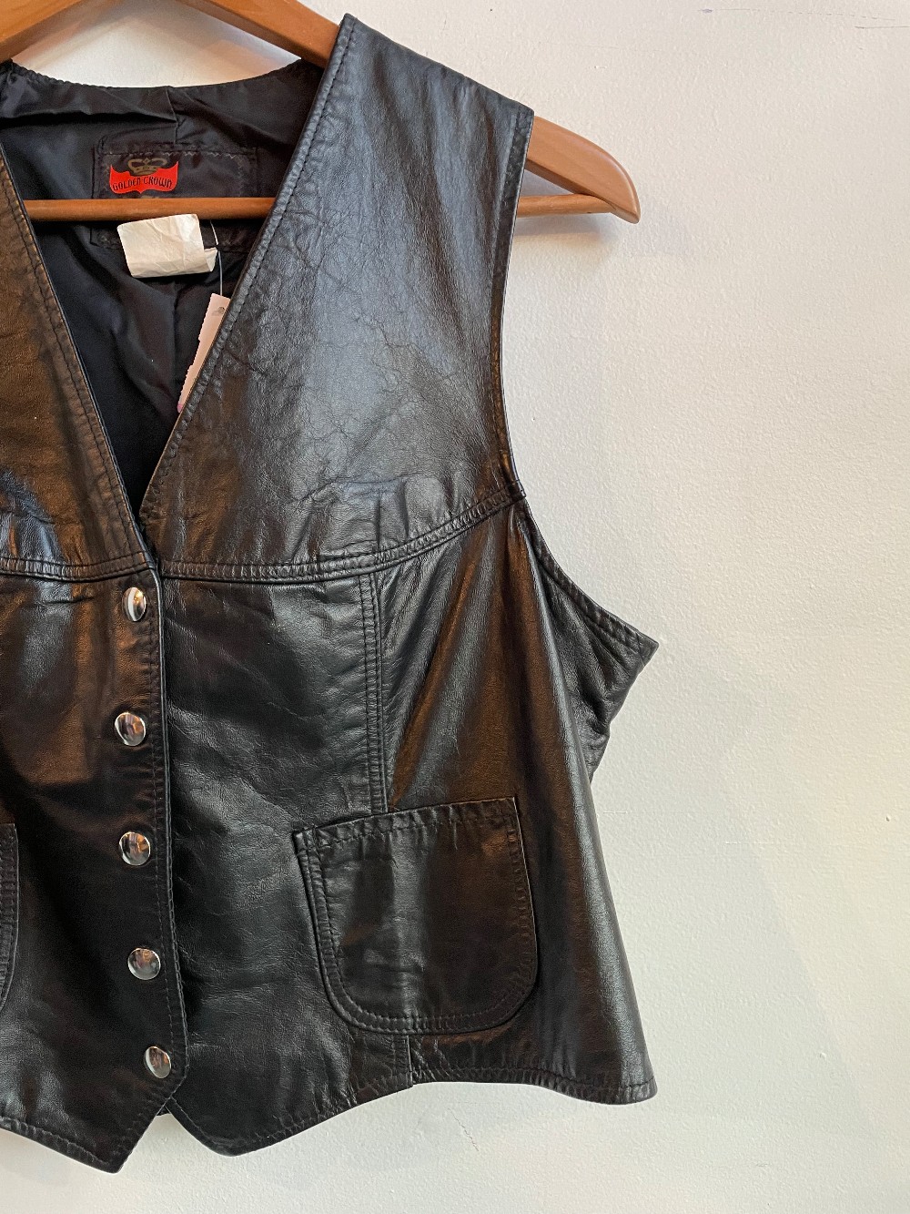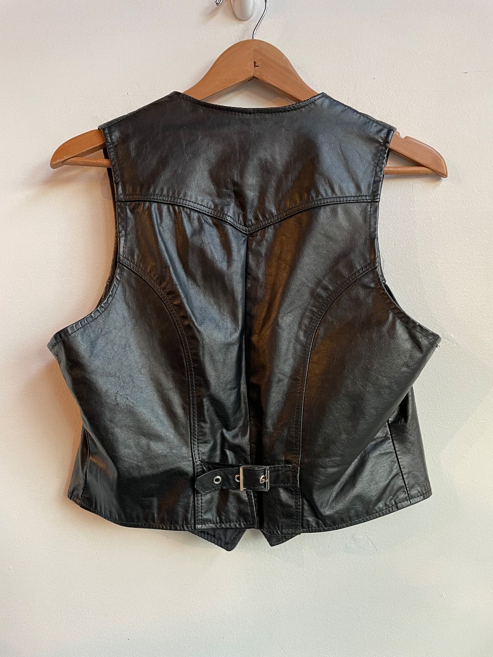 A sleek black leather vest with a rose embroidered along the chest. Features a snap button front, two pockets and a lace up back.
