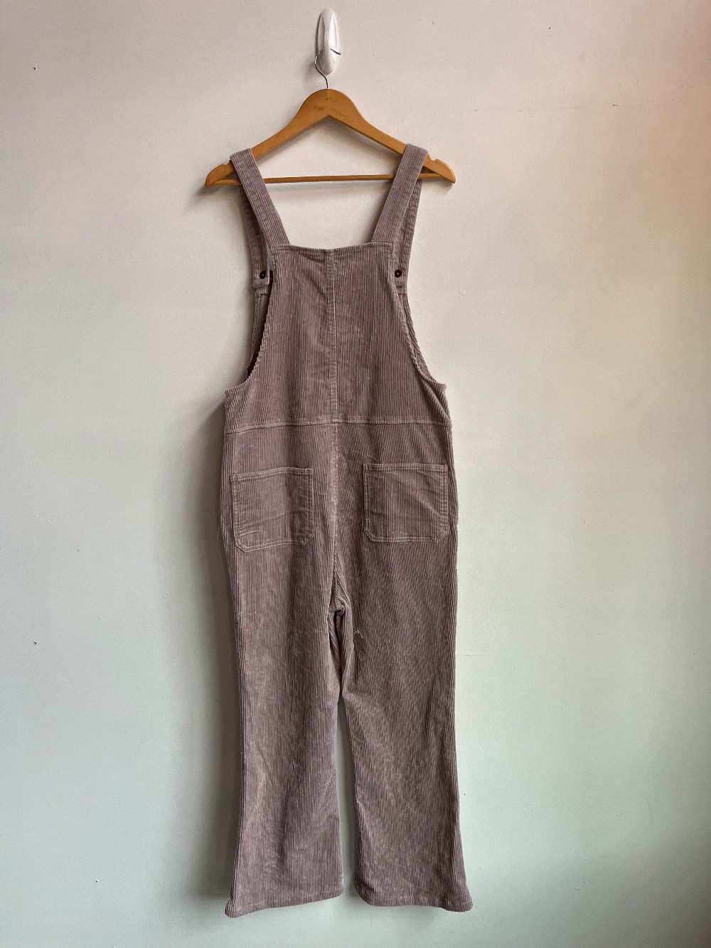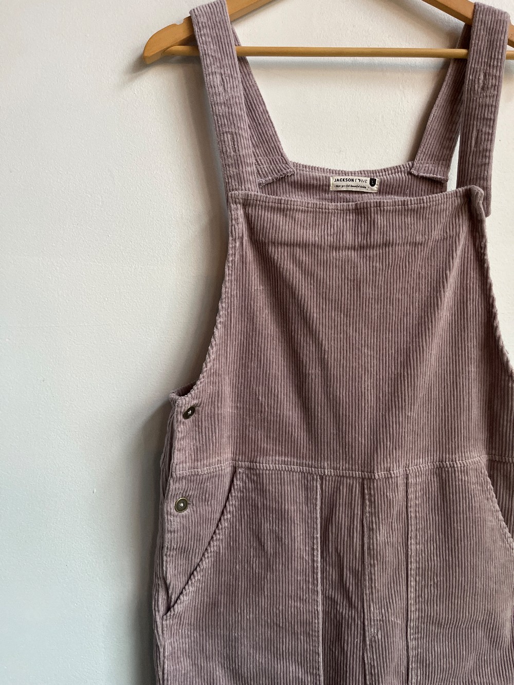 A soft cotton corduroy jumpsuit in a light lilac colour. Features pockets, button hips, and adjustable shoulder straps.