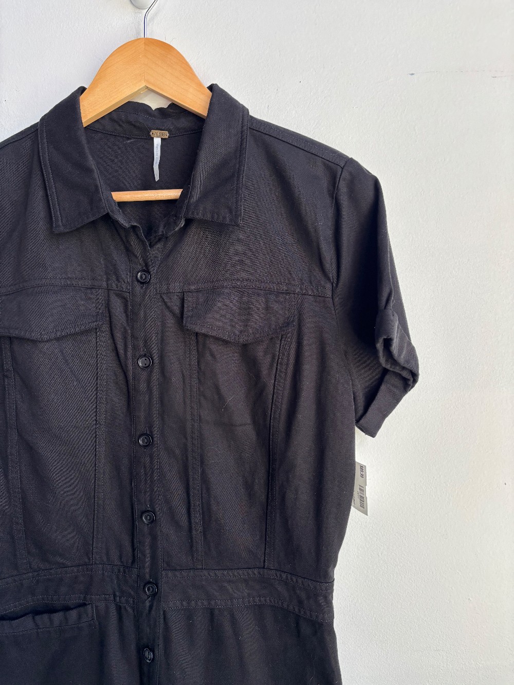 Button front short sleeve jumpsuit with full length tapered legs, rolled cuffs and a pointed collar. Made from a comfortable stretch denim fabric.