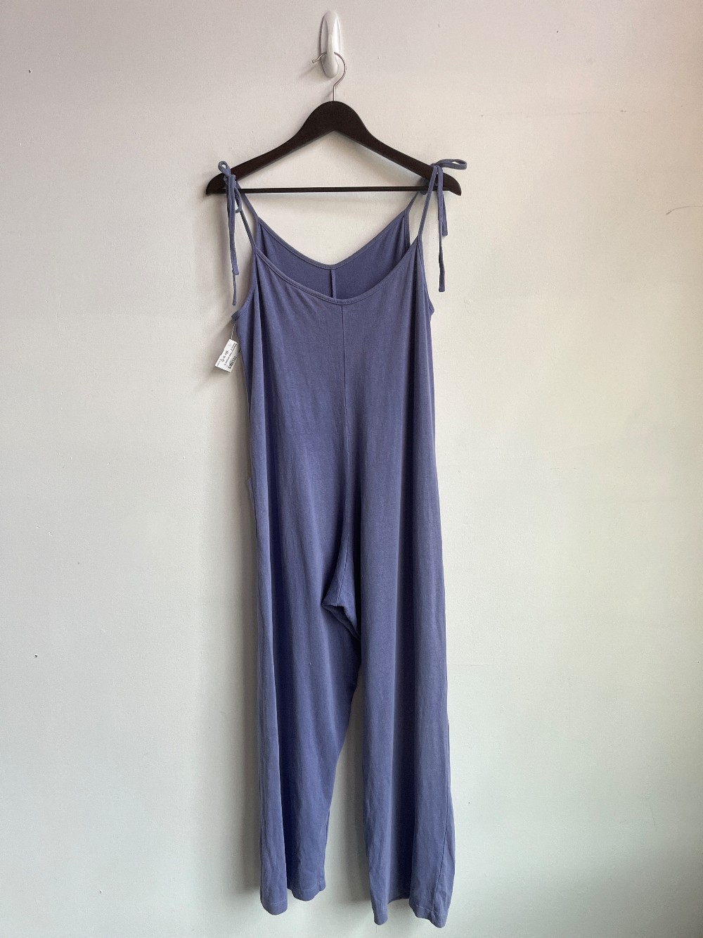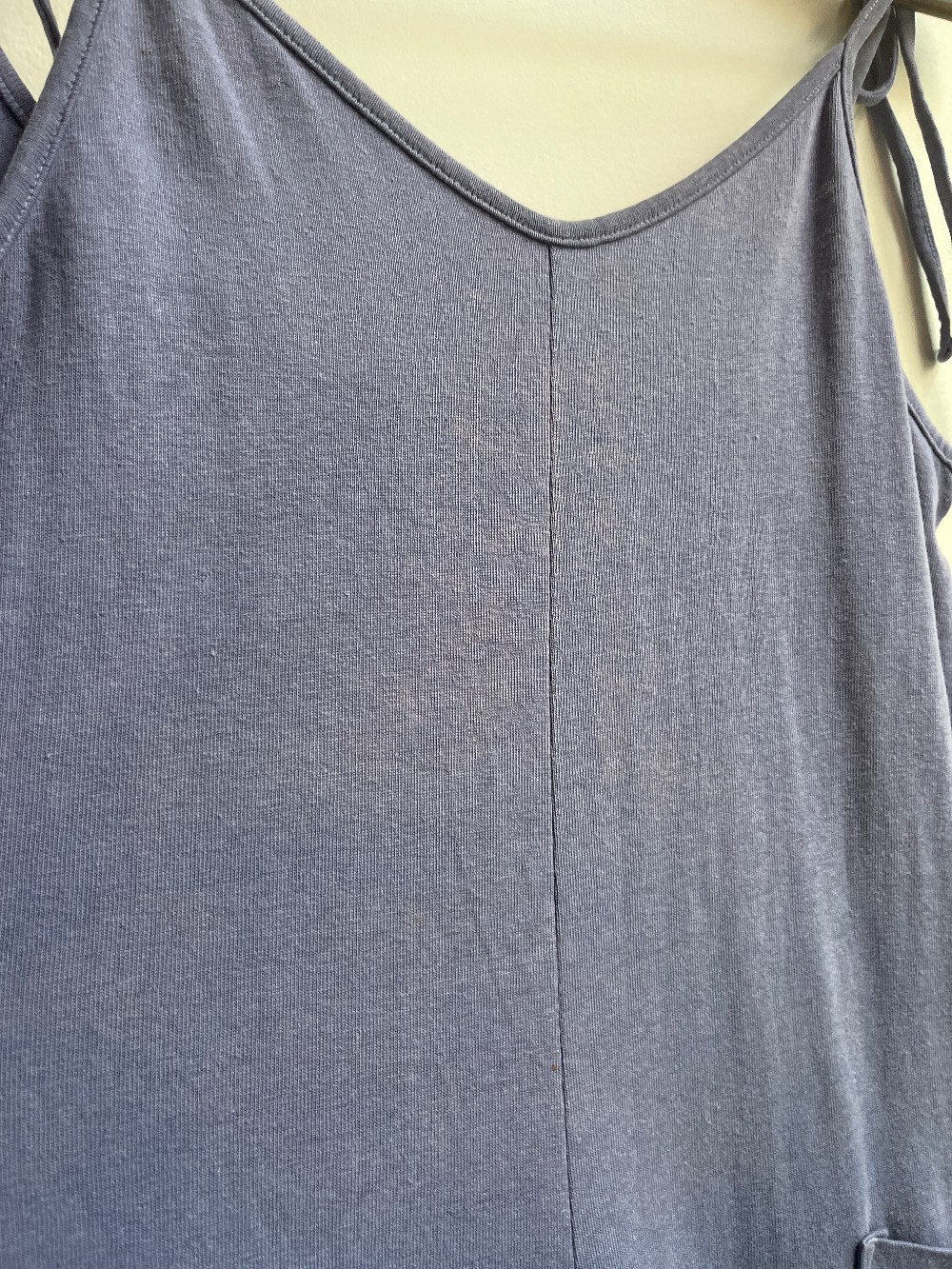 As is: slight fading on chest. A weekend getaway in jumpsuit form: Laid-back, undemanding, and luxurious. Made of the same soft + sturdy fabric as our favorite t-shirts. Shoulder ties let you adjust the length, and pockets give you a place to put your hands/phone/lucky pebbles. Wear this jumpsuit while youre road tripping, hanging out at the lake, or lounging in your bed. You can layer it over a tee for an overalls look, too!