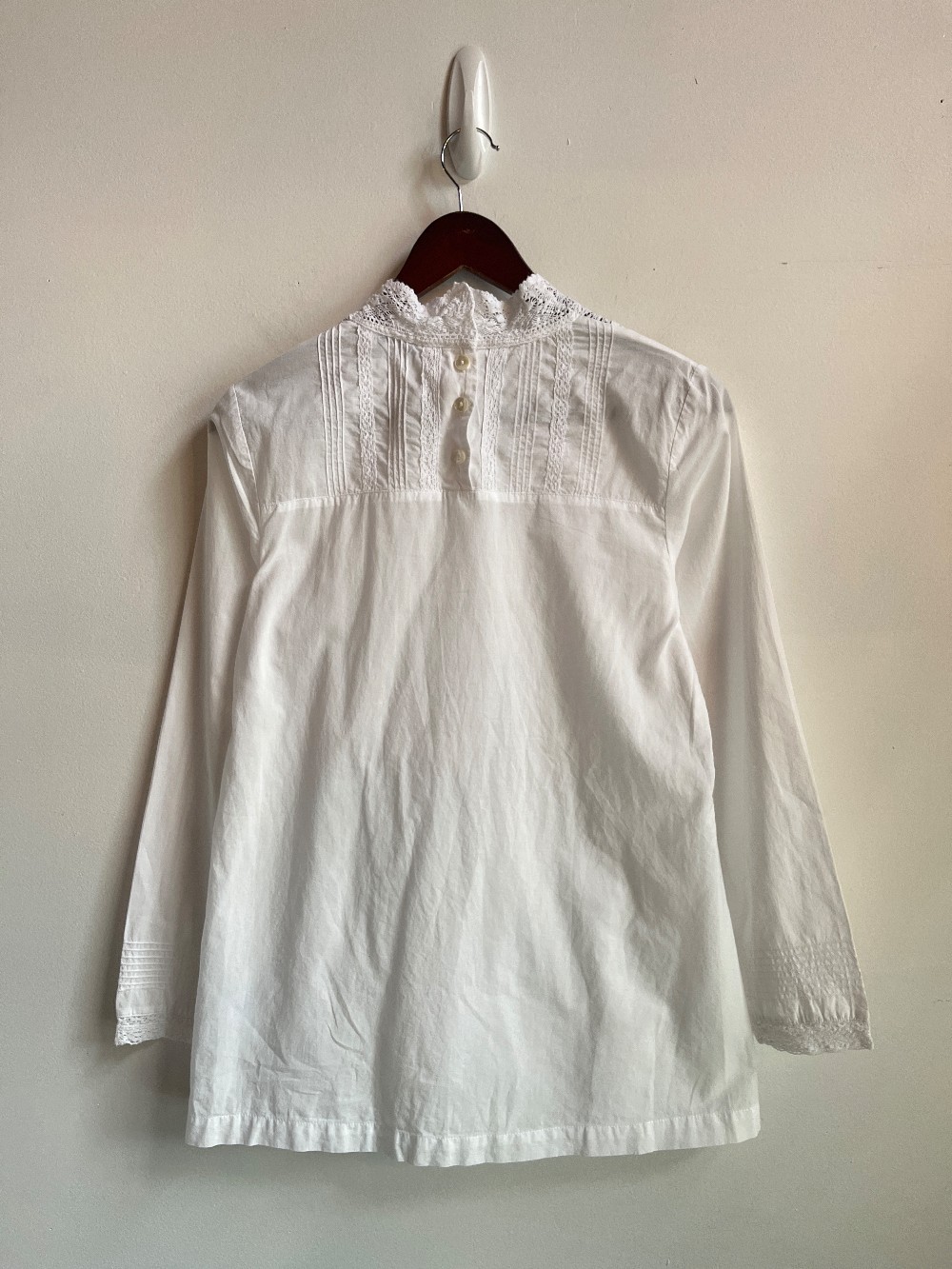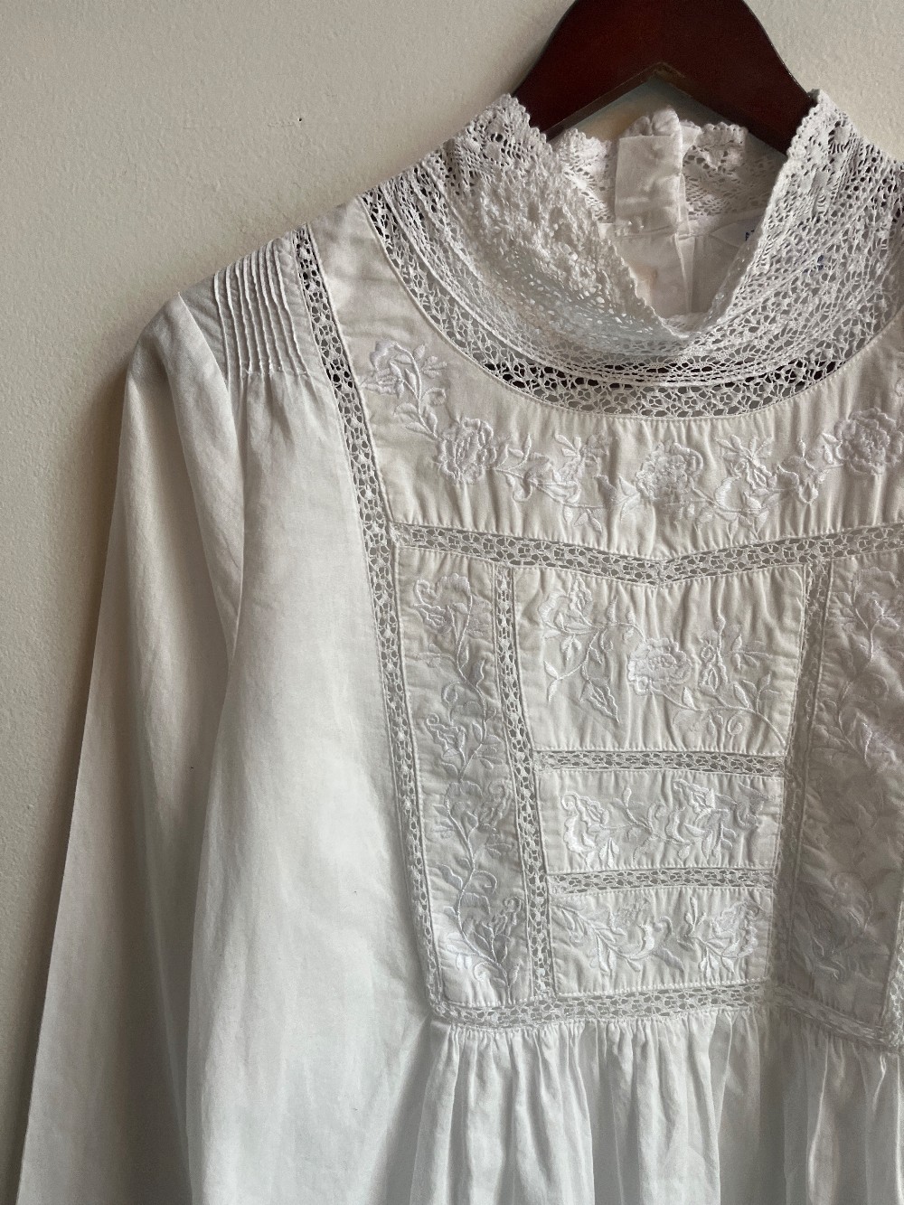 A cute blouse with a high neck, long sleeves, embroidered chest detail and button up neck. Fabric is light cotton