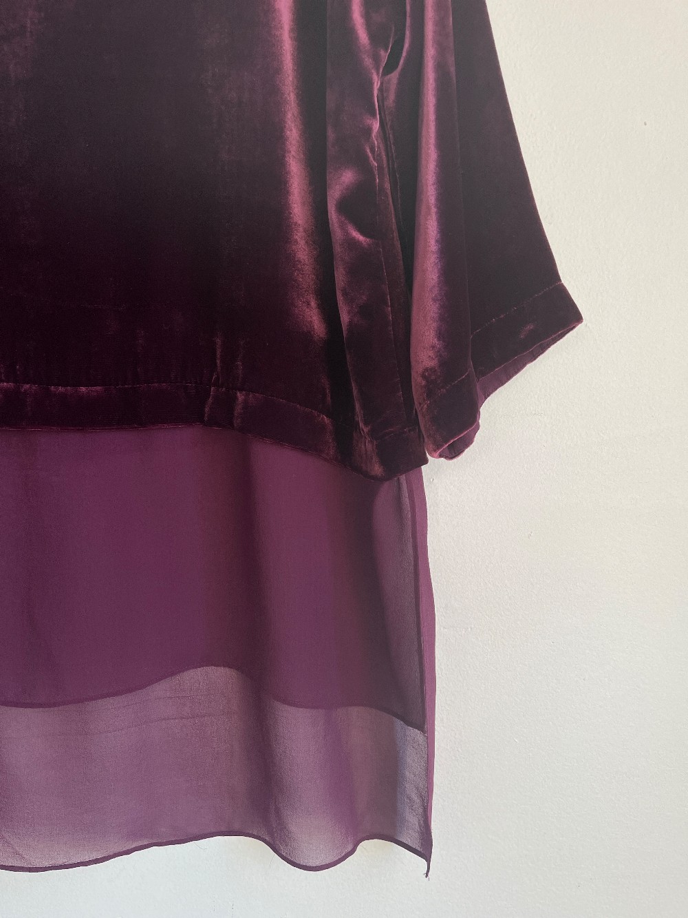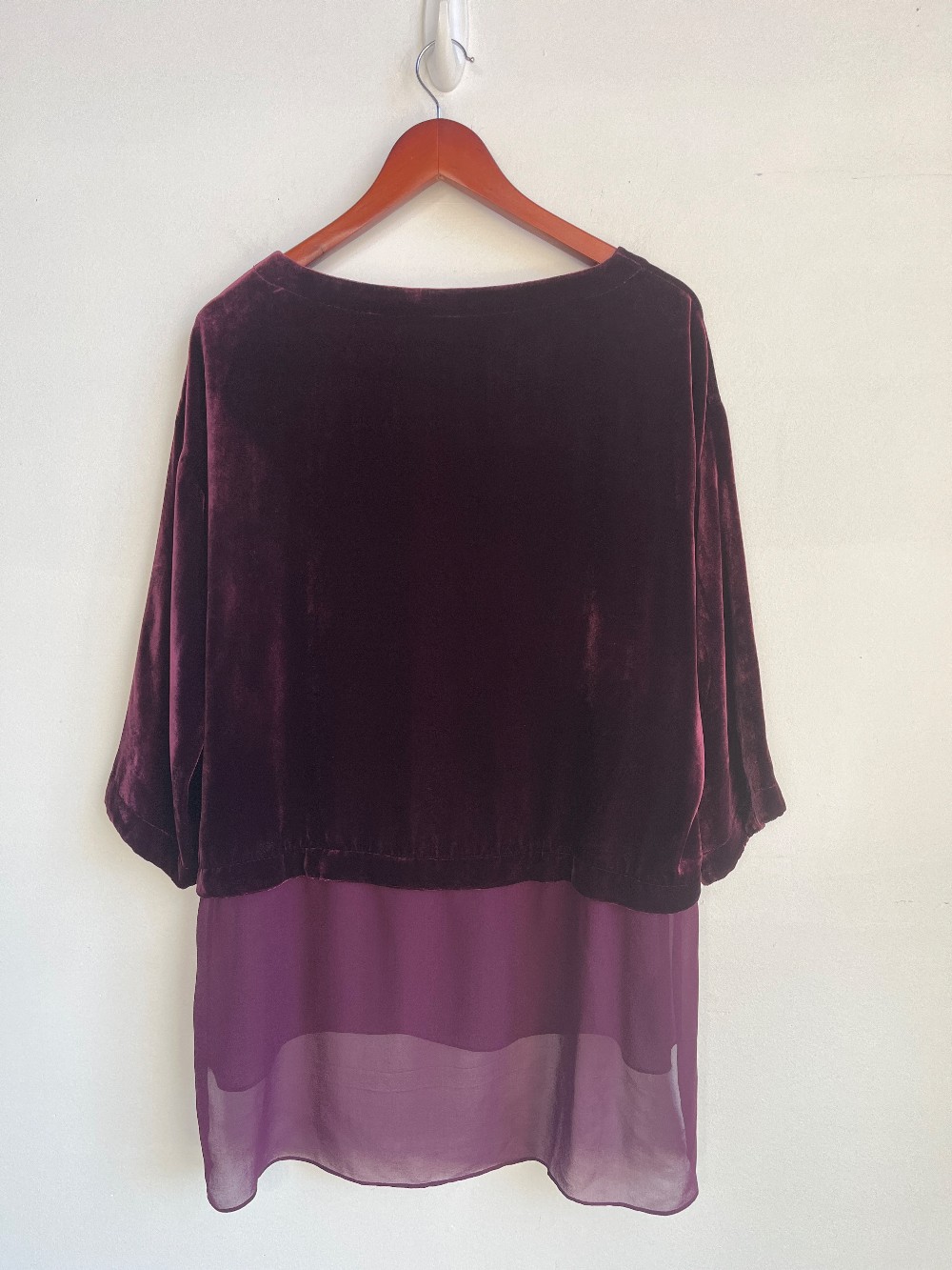 Luxurious Silk Velvet top with a boat neckline, 3/4 length sleeves and a sheer silk bottom fabric layer