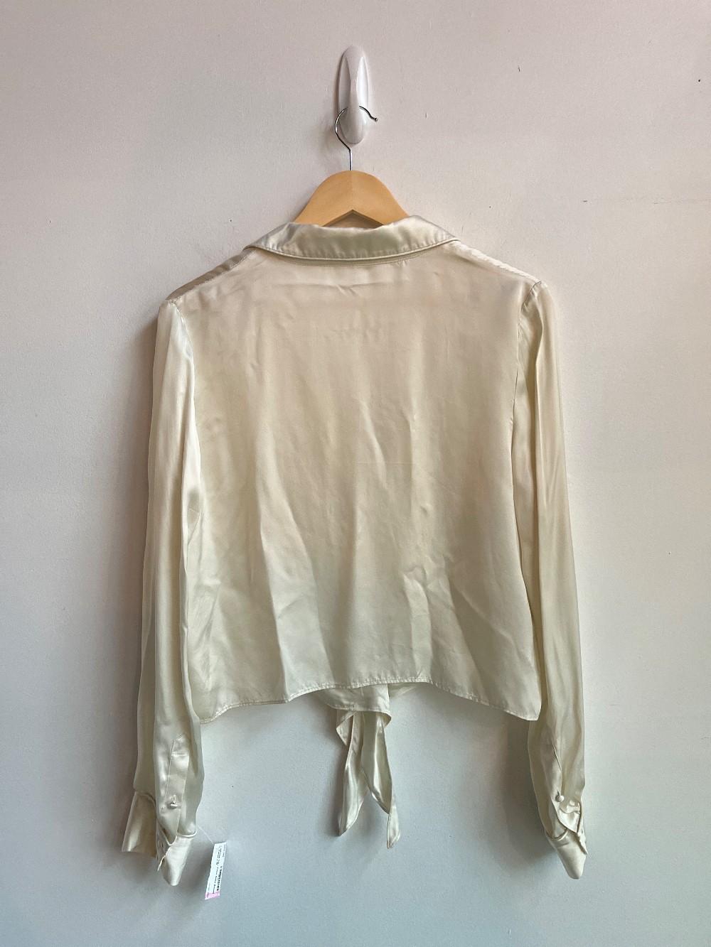 This is a button-up blouse with a notched collar and a tie at the hem. It’s made from Effortless Satin™ — drapey, lightweight Japanese satin with a glossy look and feel.