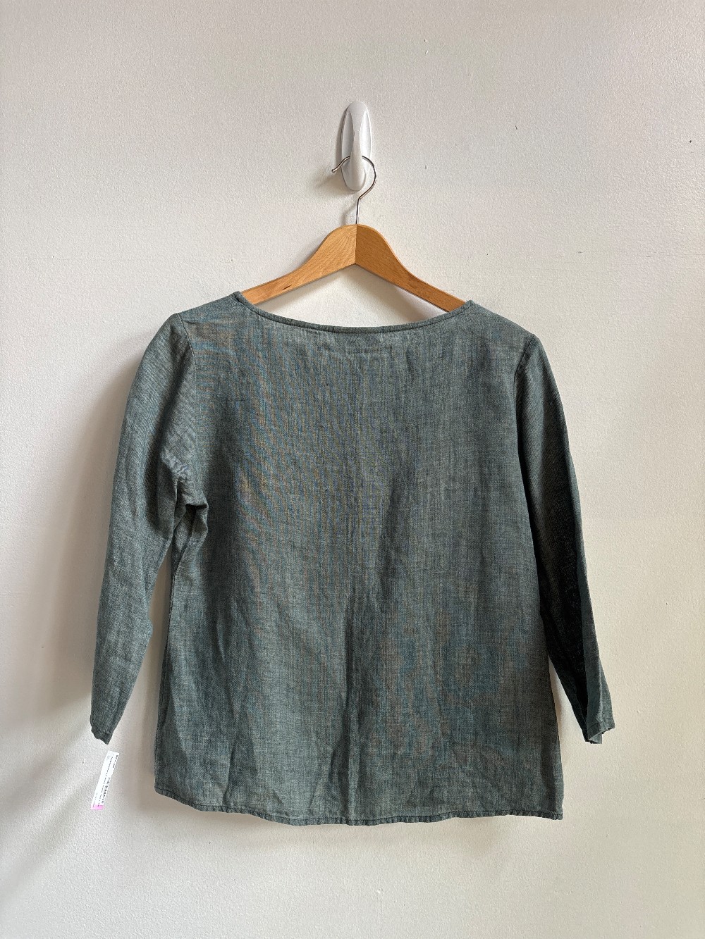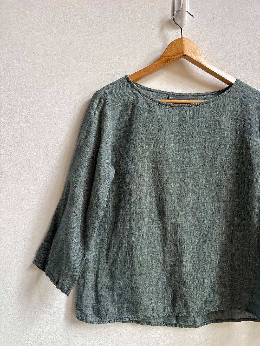 A breathable blue duel toned top made from 100% linen material in Estonia. Features a wide neckline, slightly cropped sleeves, and a lax torso.