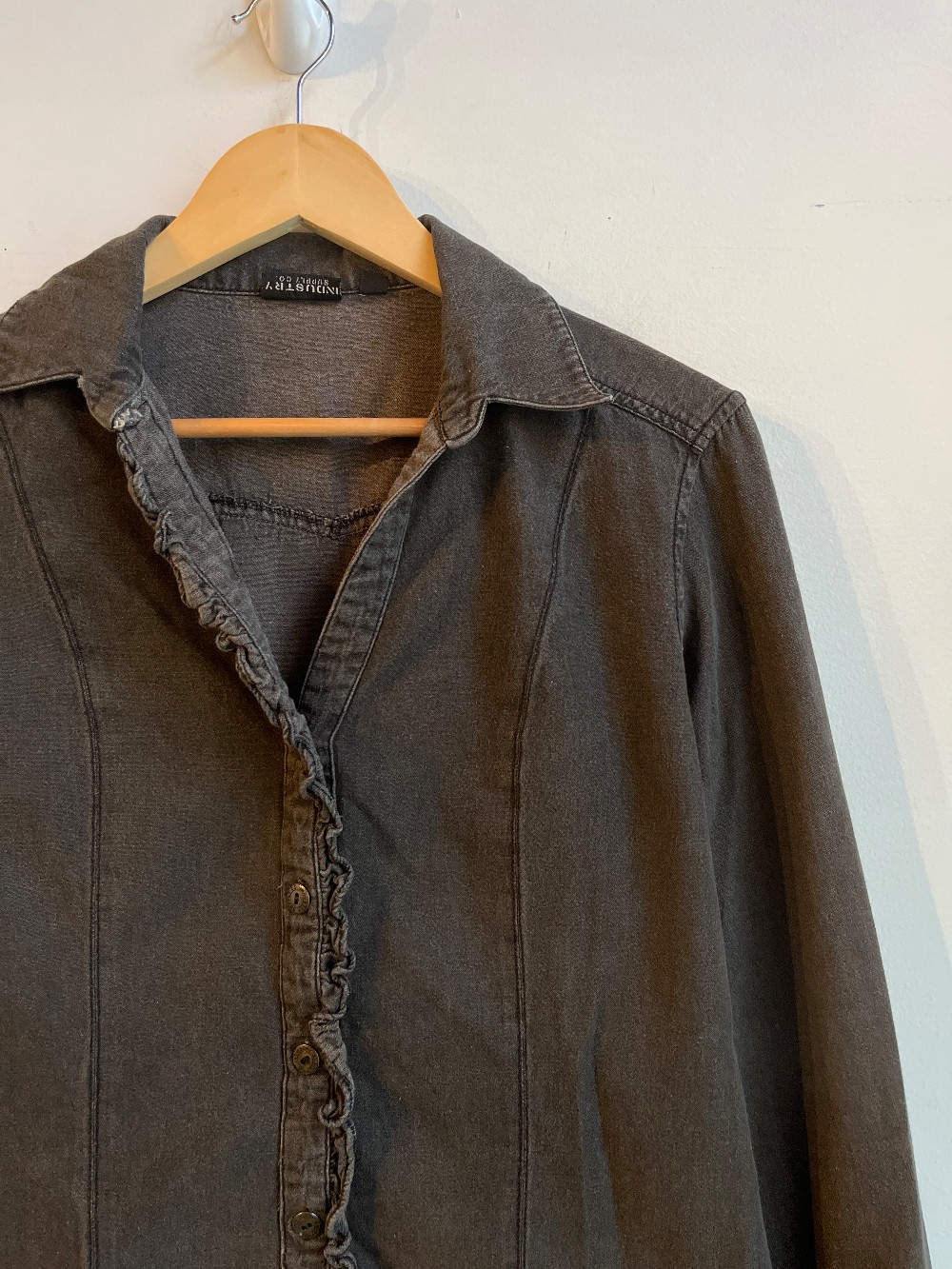 Fitted silhouette long sleeve button close shirt with ruffle detailing on side of placket and edge of sleeves.