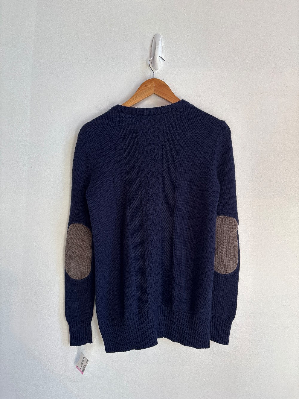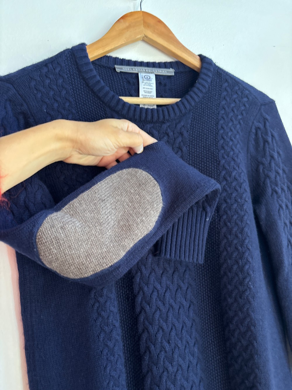 A luxe merino wool and cashmere blend sweater with a cable knitting pattern, high neck and contrast elbow patches. Knit is soft with lots of stretch