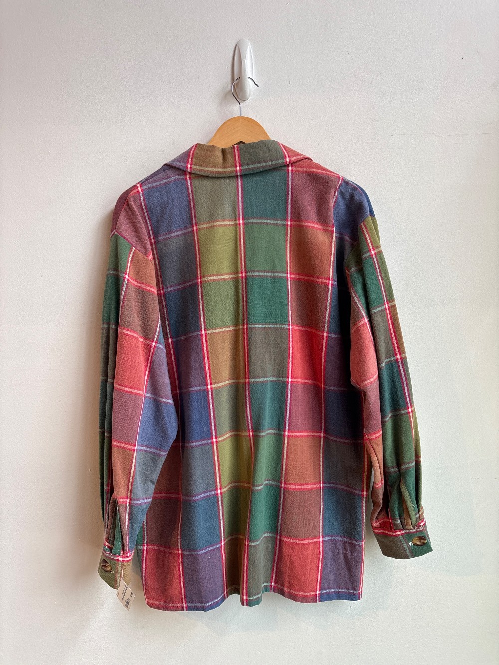Would fit large-xlarge best. Yes, it’s a tablecloth! A handmade button up shirt with a relaxed fit, side pockets, collar and long sleeves. Fabric feels like cotton and is blue/red/green
