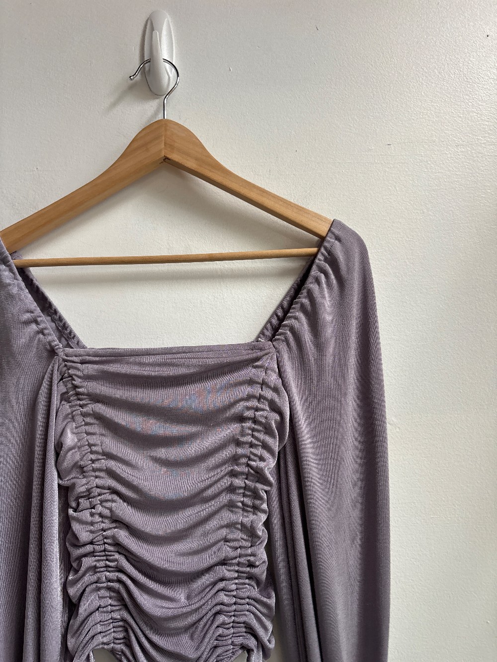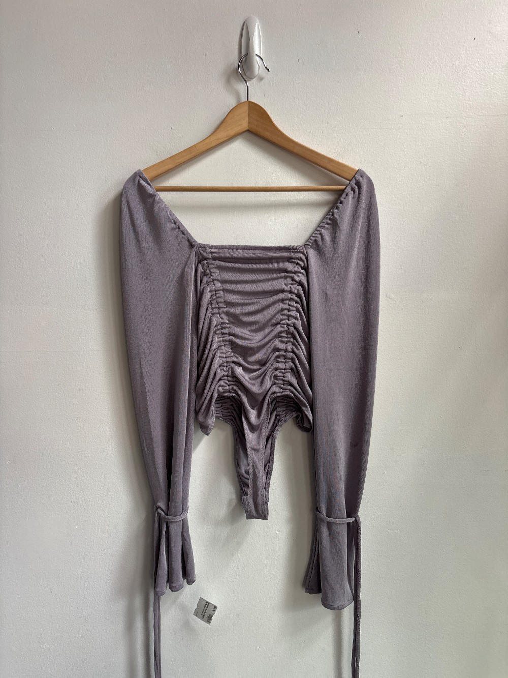 "Shiny metallic stretch knit shapes this chic bodysuit that has a square neckline and long trumpet sleeves with tying accents at the wrists and elastic at the shoulders. The fitted bodice is accented with two cinched panels that create a gorgeous ruching effect. Attached thong bottoms have snap closures."