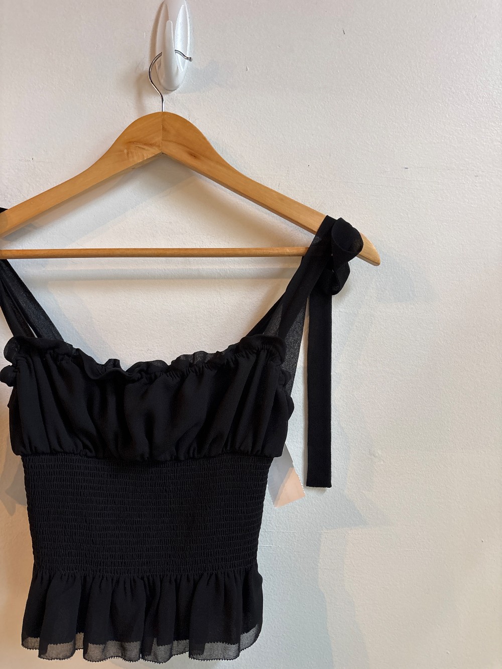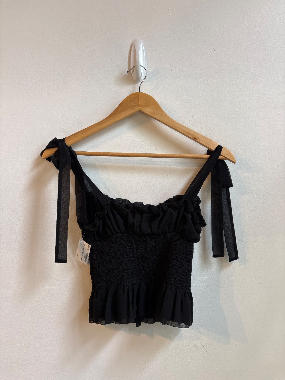 This is a square-neck camisole with a smocked bodice, ruffled peplum trim and straps that tie at the shoulder. It’s made from lightweight, semi-sheer chiffon.