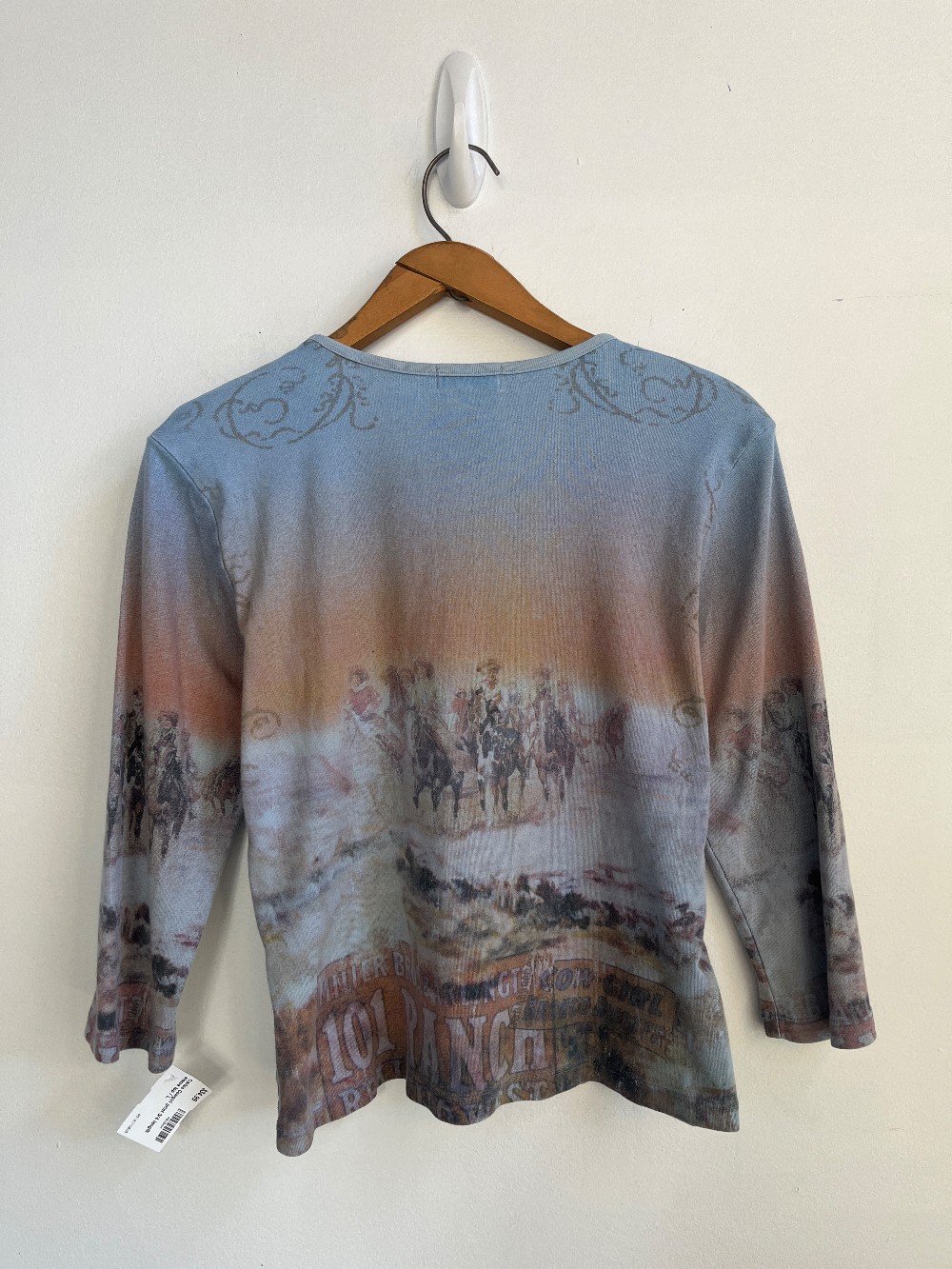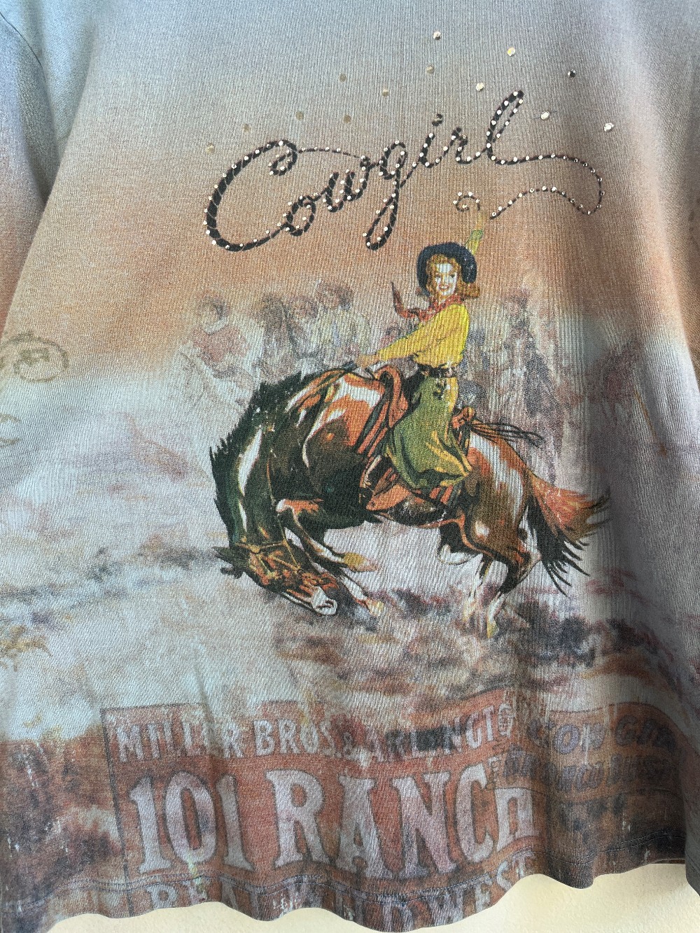 Cute light blue 3/4 length sleeve top. Featuring a vintage image of a cowgirl on her front with “Cowgirl” text, highlighted by rhinestones