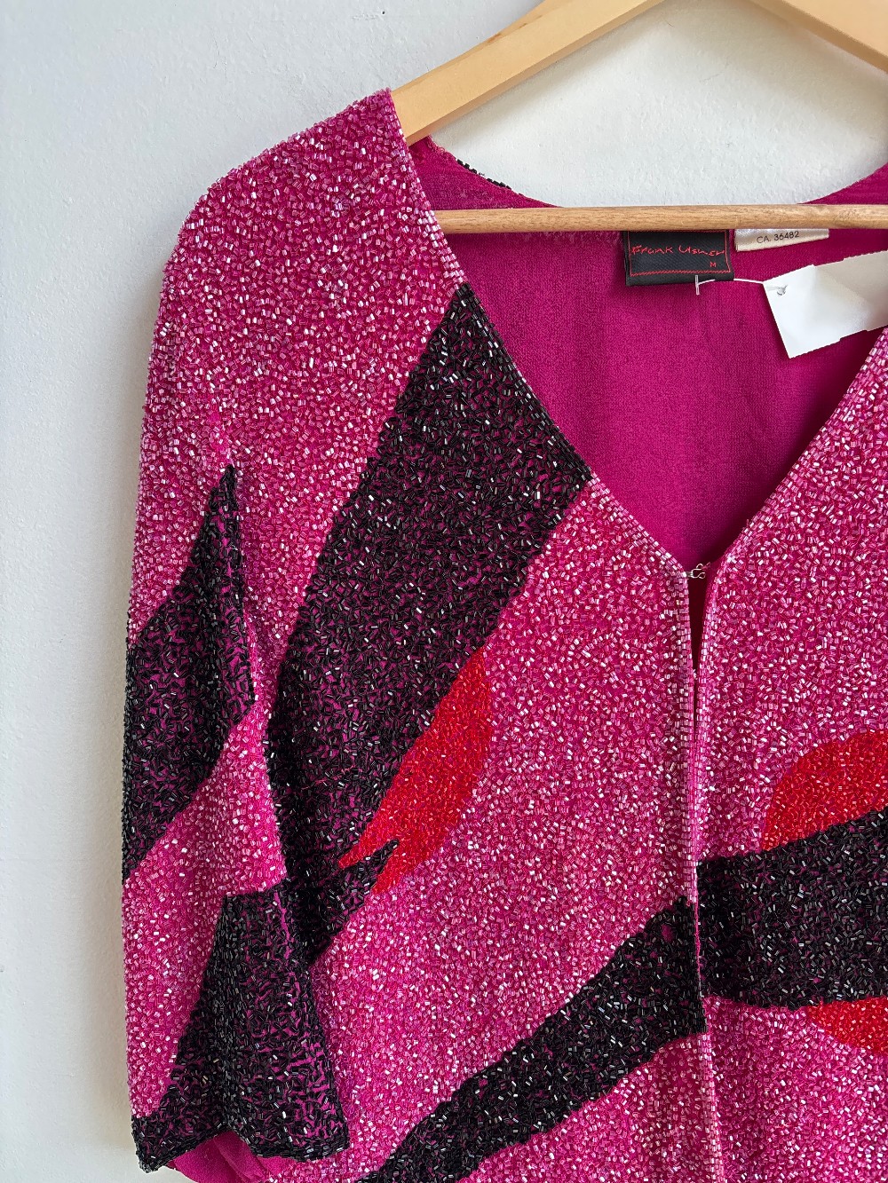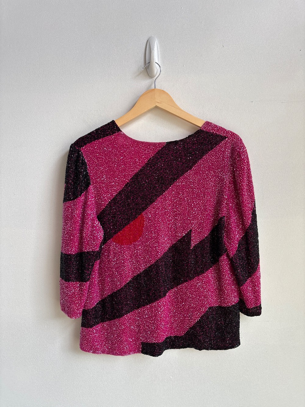 A delightfully sparkly pink cardigan with patterns of black and red. Features pink inner lining and a two clip front.