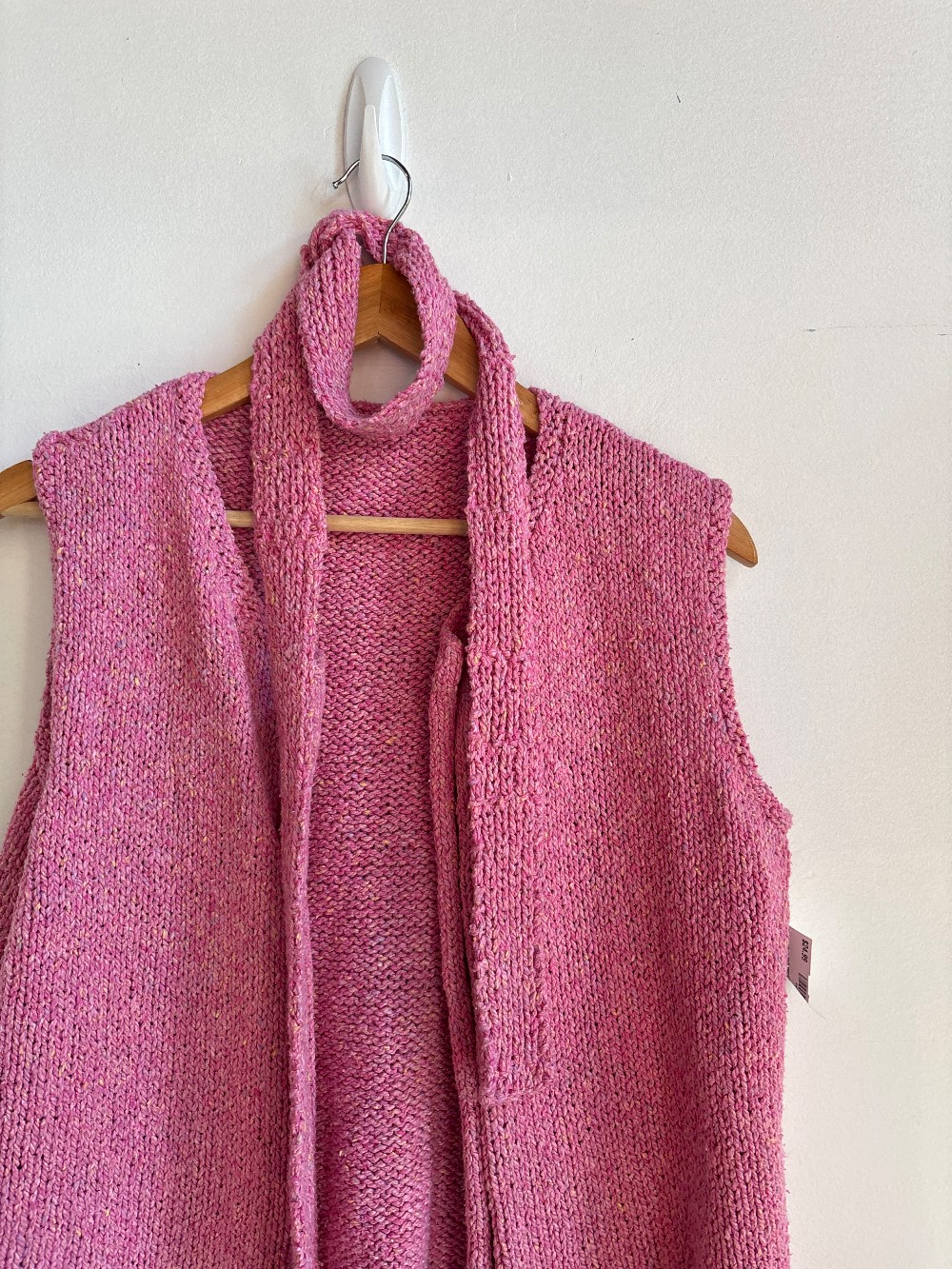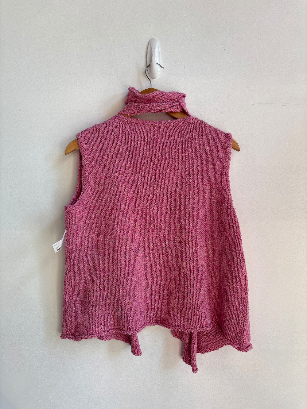 A cute pink vest featuring a wide neck, sleeveless, open front, belted waist