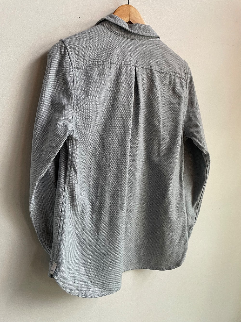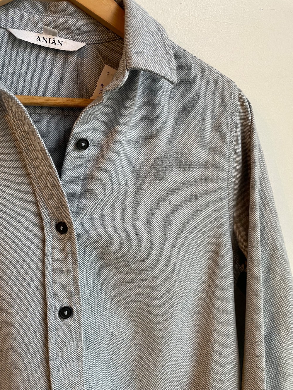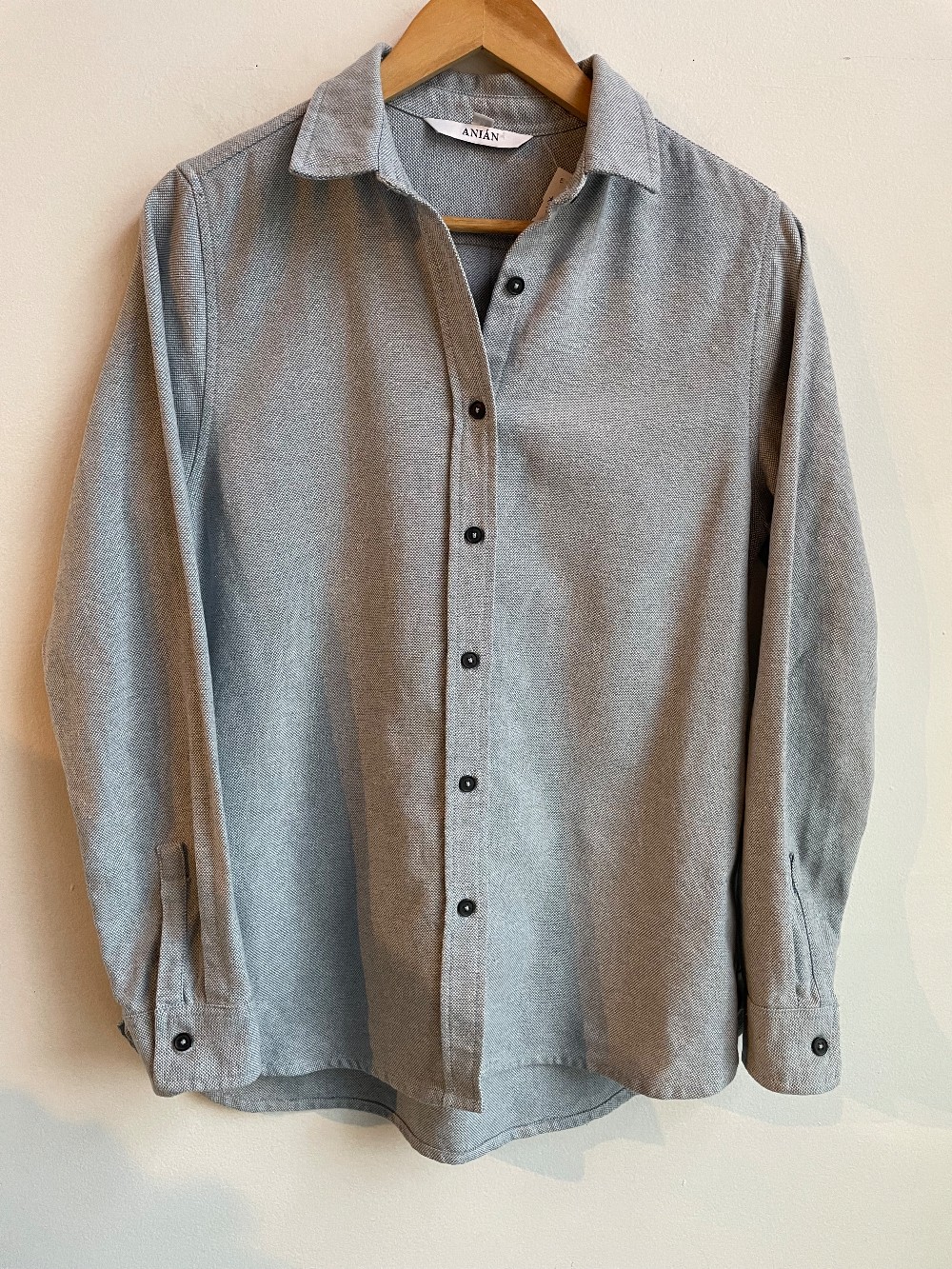 * AS IS: Small yellow dot/mark on right sleeve. A light and airy button up shirt from Anian, made with care and intention. There are dark blut buttons up the front of the collared shirt. A perfect layering piece.