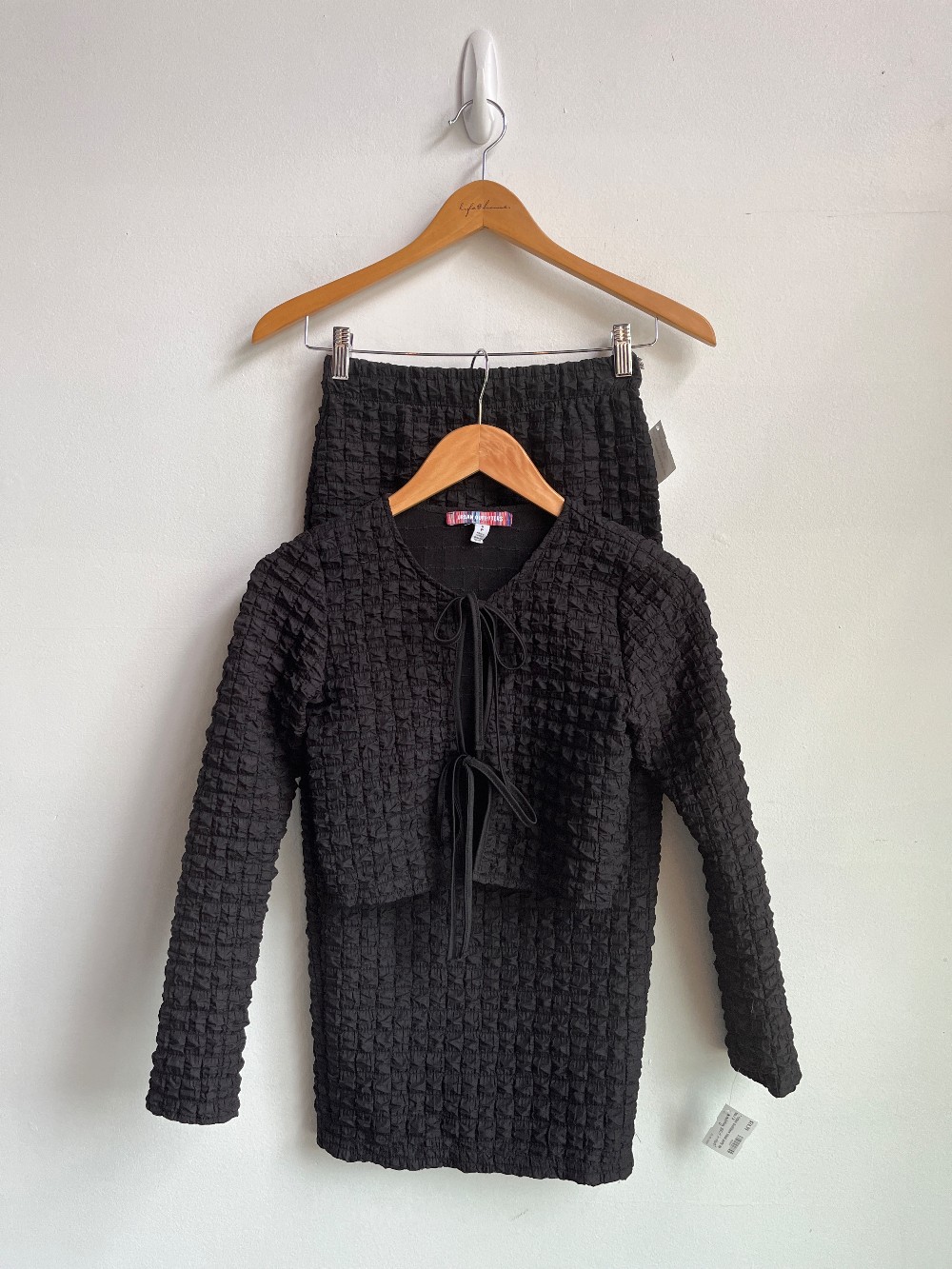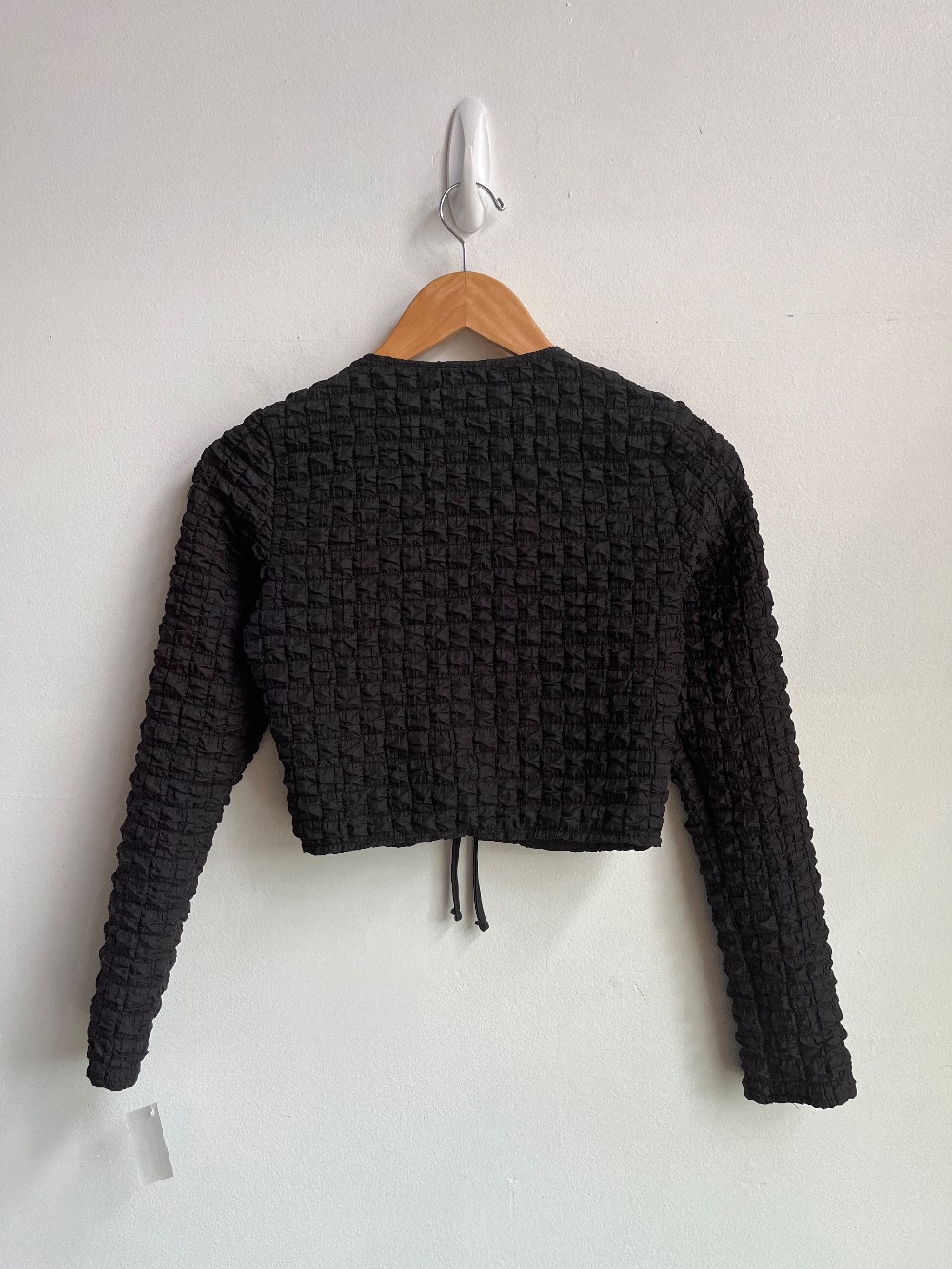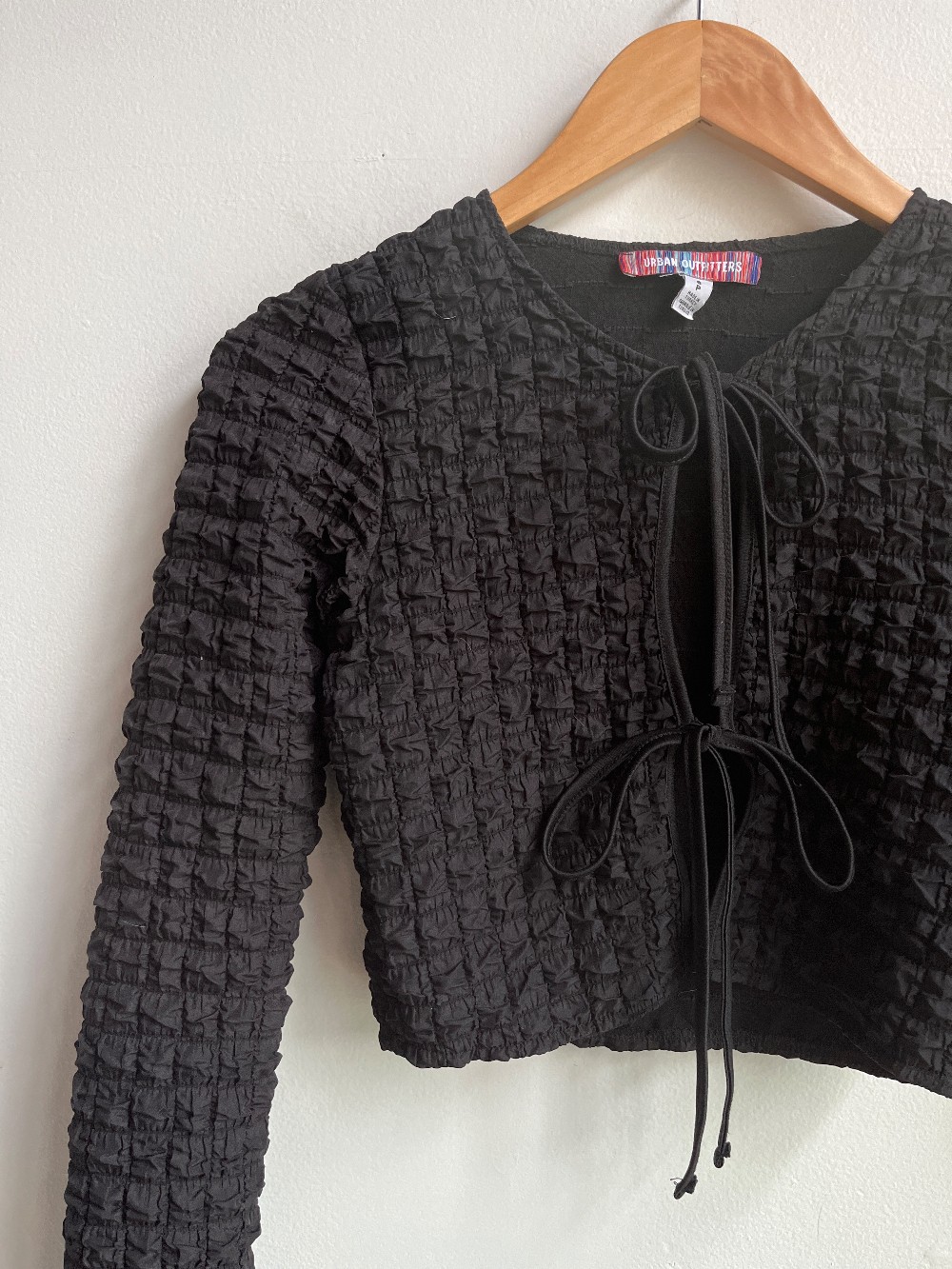 Matching skirt in store! A fun square patch work, puffy crop top with a two strap tie front.