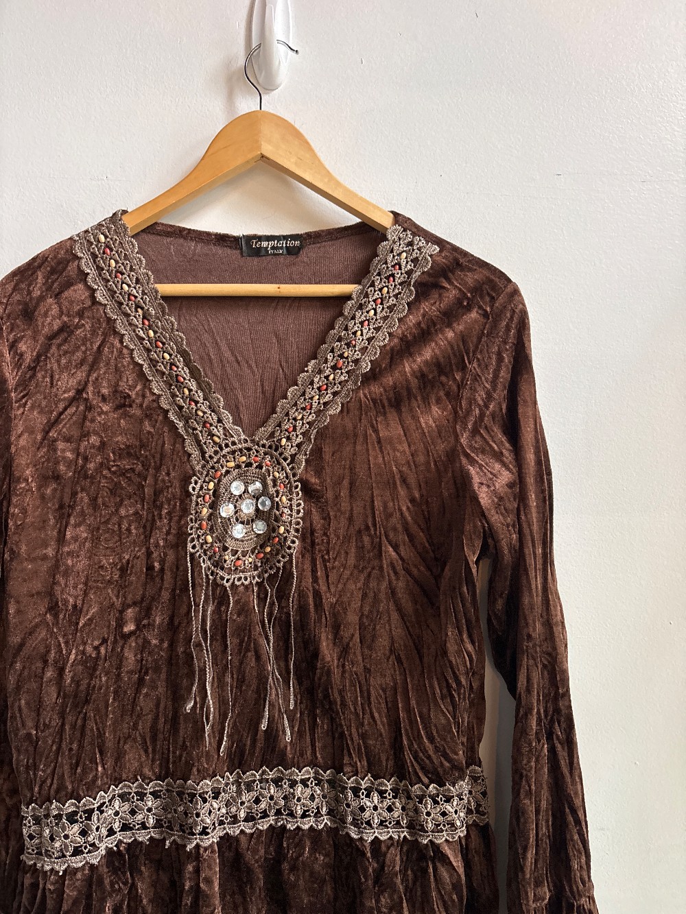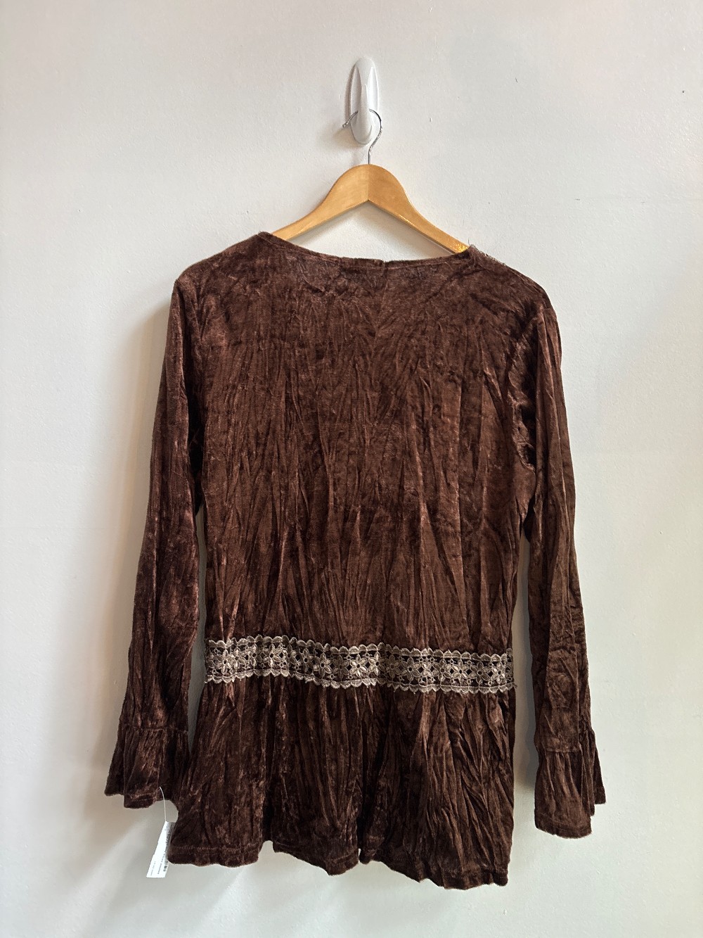 Would fit large best. A brown beaded/ crochet detailed top with a V neck, peplum hem and long sleeves with flares.