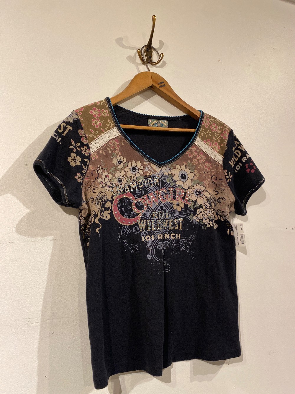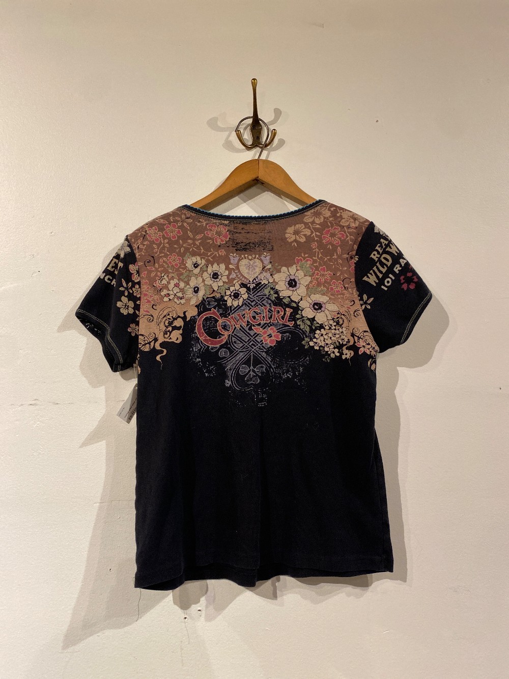 Adorable Y2k styled tshirt with bejewelled graphics and a scoop neck. Made from stretchy cotton