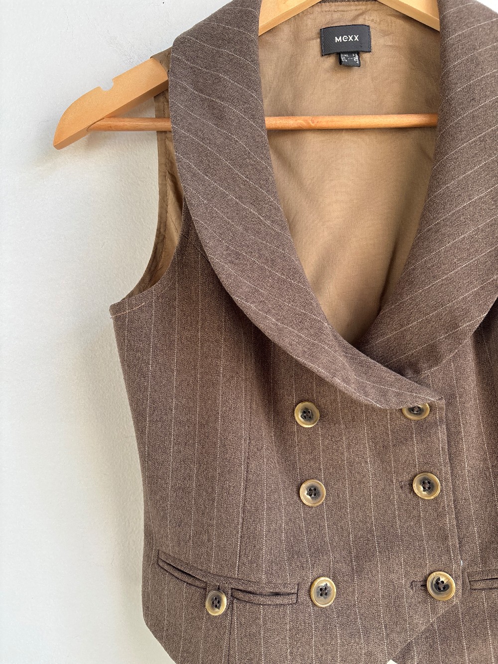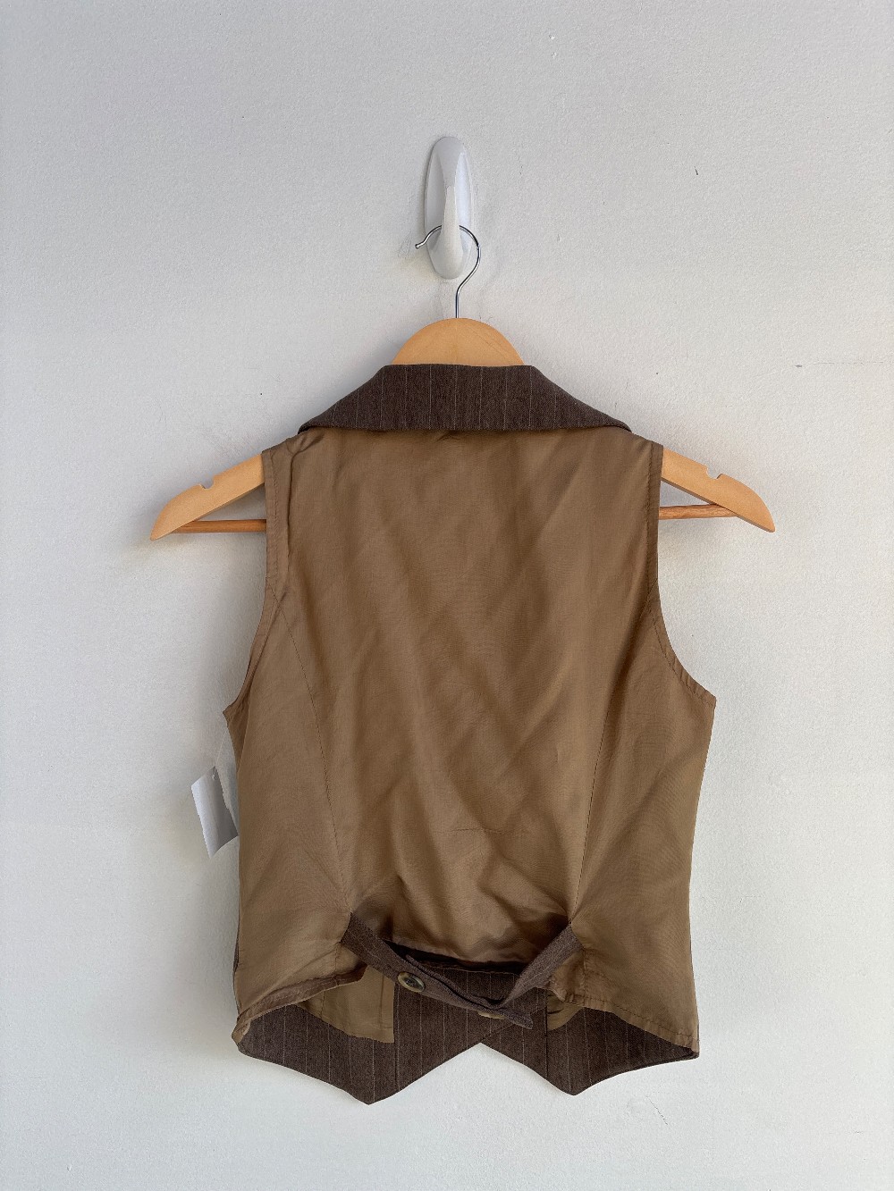 A roll collar pinstriped vest with a double breasted front and two small pockets. Features a beige back lining.
