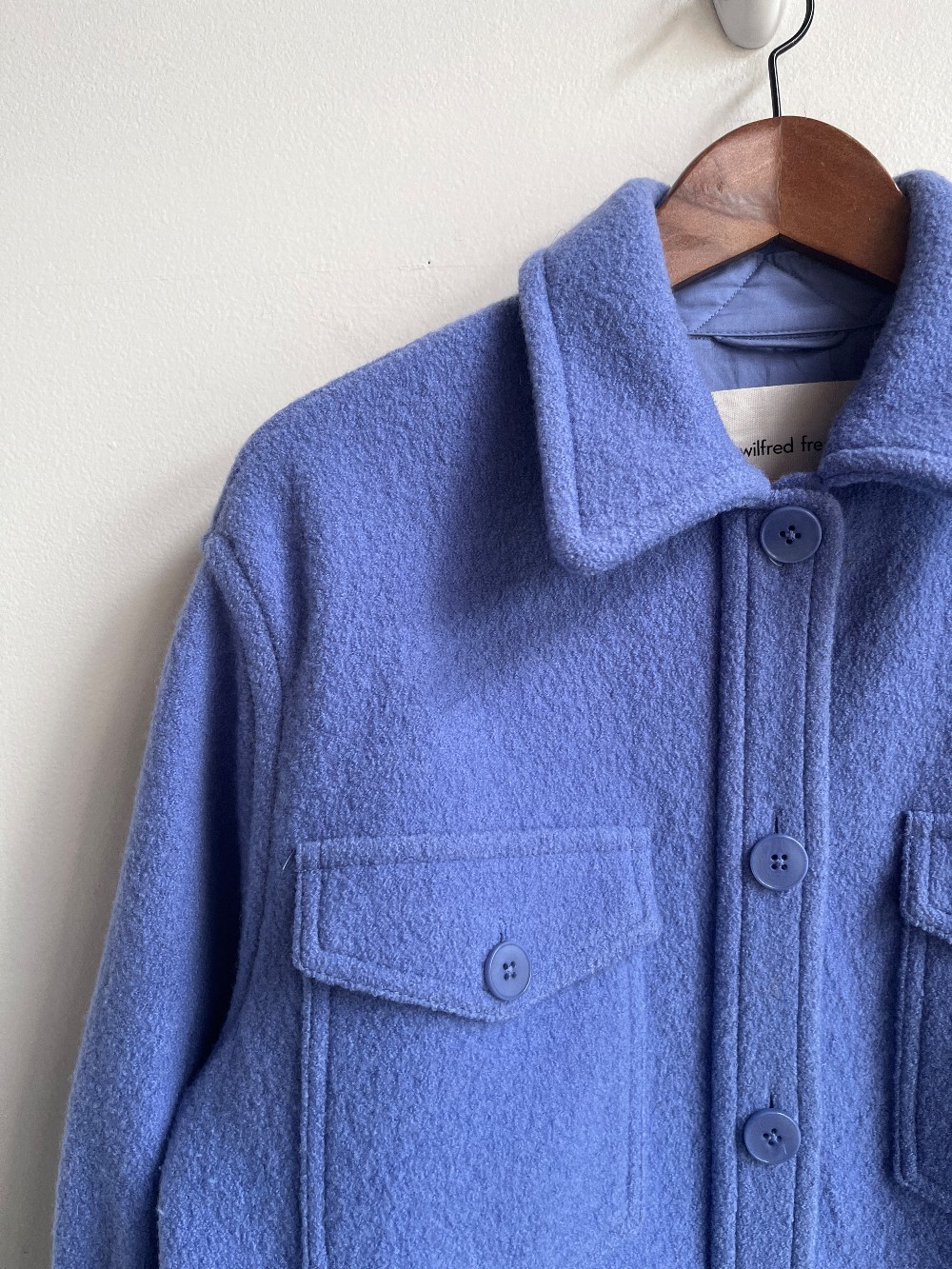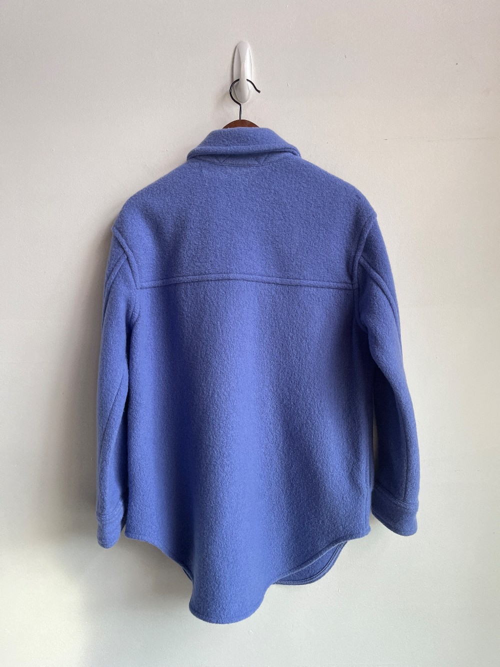 Merino wool and cotton button up shirt jacket in periwinkle. Designed with two front chest pockets and two seamless hidden pockets.