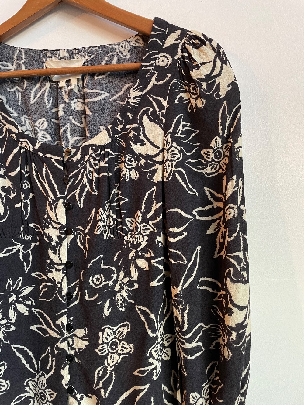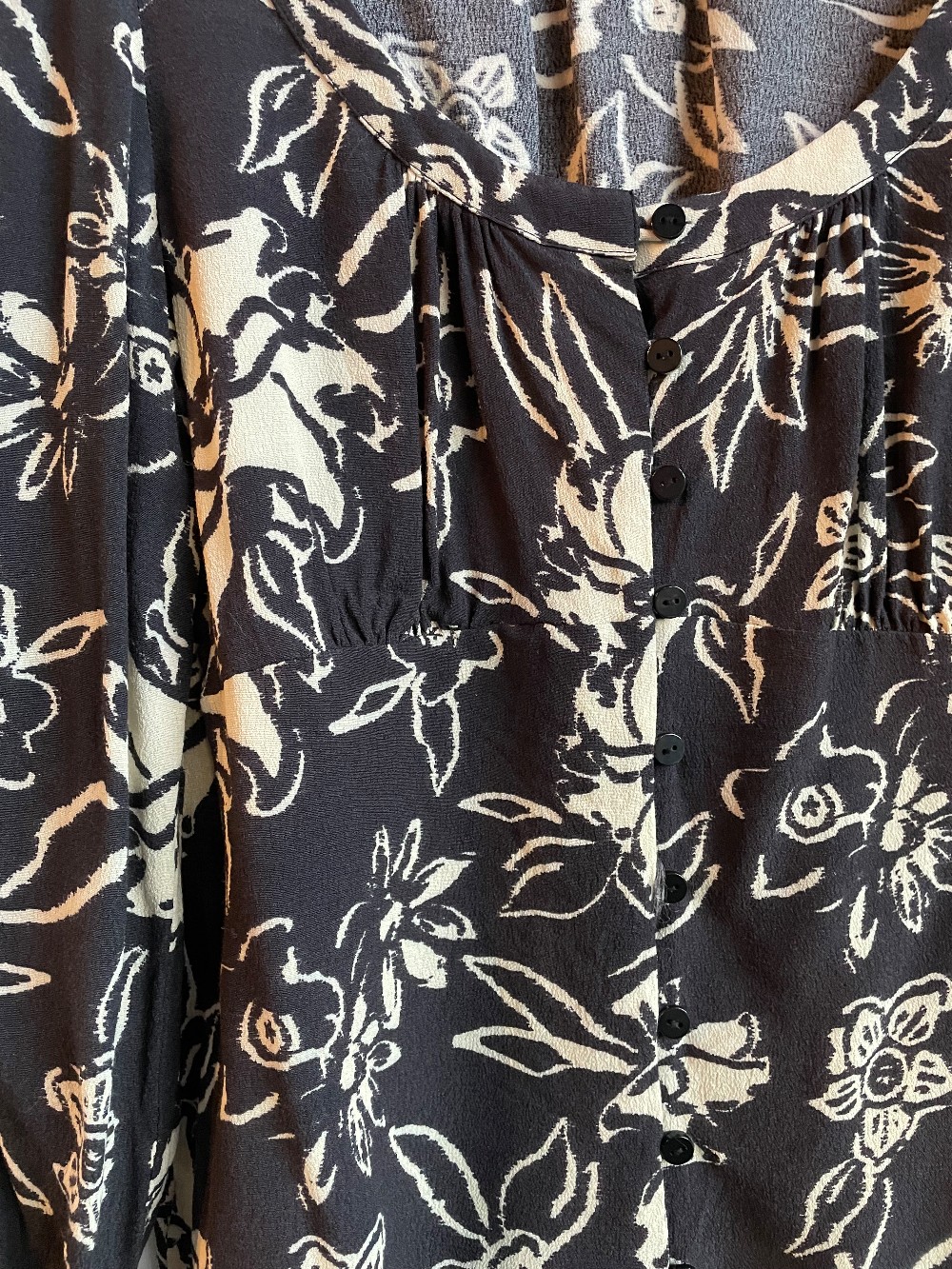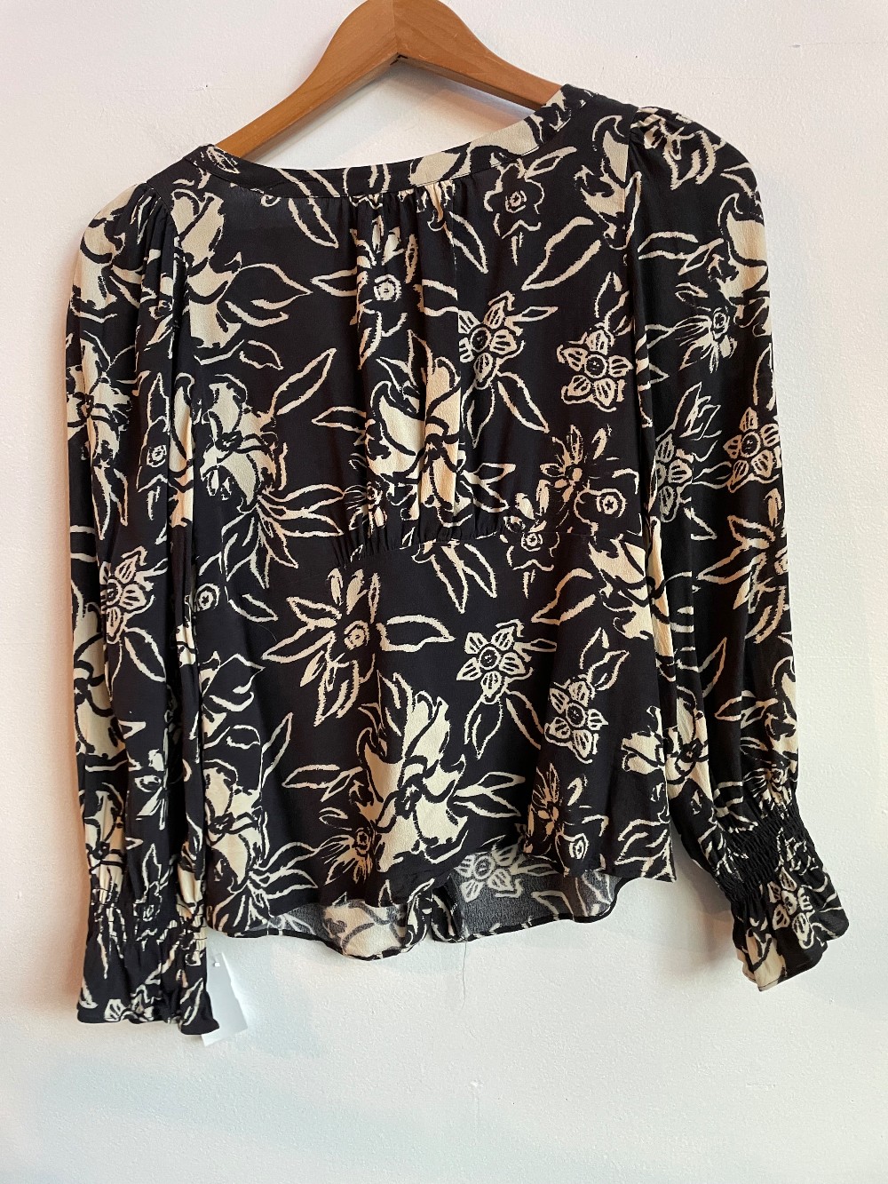 An adorable cream and grey floral print blouse with a ruffled bust and a button down front. Features puff sleeves with a long fit and ruffled flared cuffs.