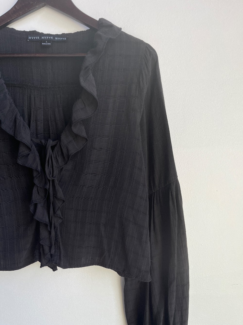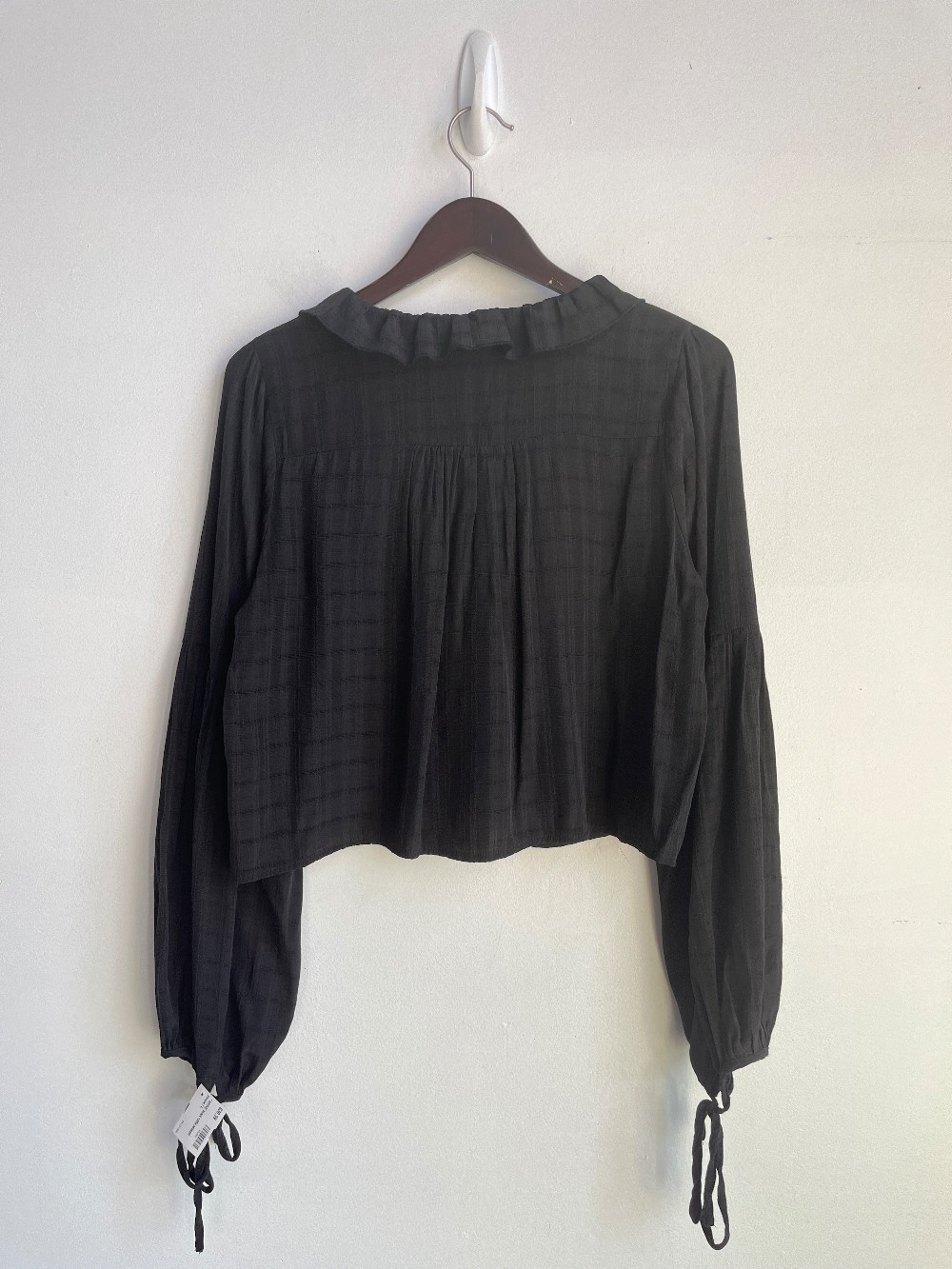 A fun billowy blouse with a tie and button front, long peasant sleeves with ties and ruffle trim. Material is light and feels like rayon/ poly blend