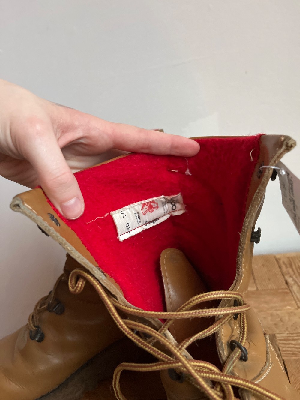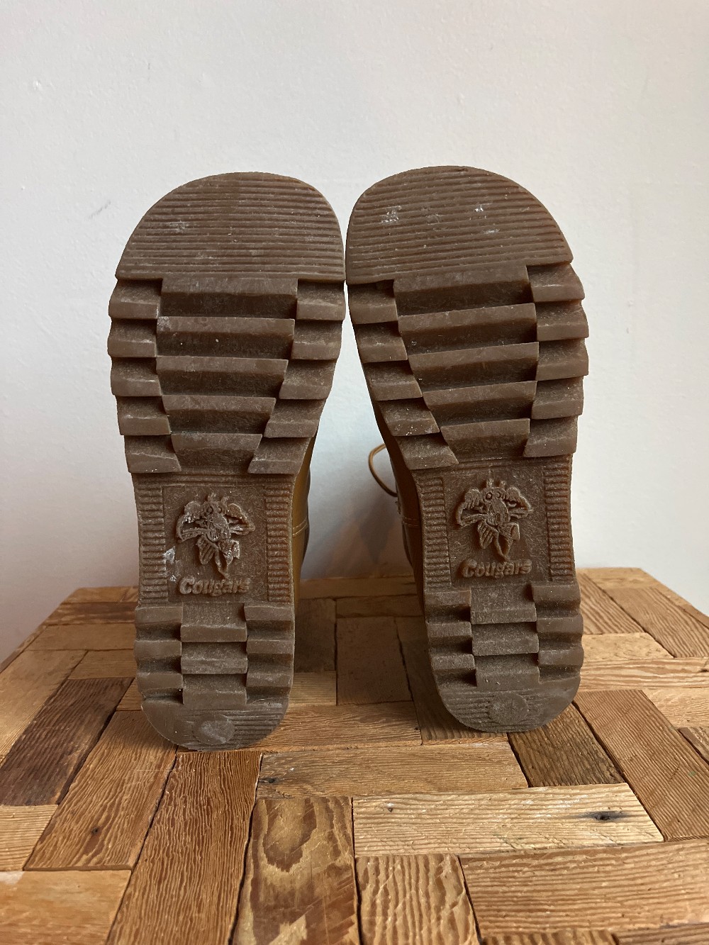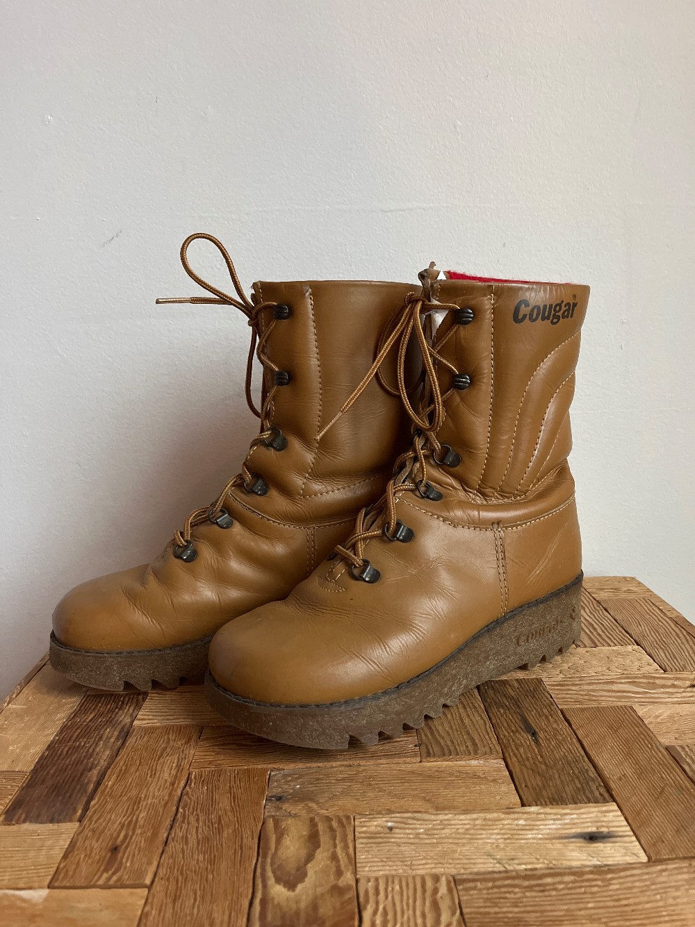 Size 8 womens. As is: scuffs on toes/ creases on outer. Come in to try on! In 1976, a Canadian classic was born. A leather, calf-high lace up with its famous red lining took an entire generation by storm. This fashion icon is born again in the Women's 39068 Original Boot by Cougar. The molded memory foam features a removable insole for easy cleaning, while the waterproof leather is designed to keep feet dry throughout the seasons. The Pillow Boot is back!