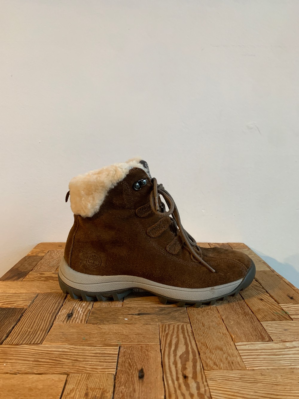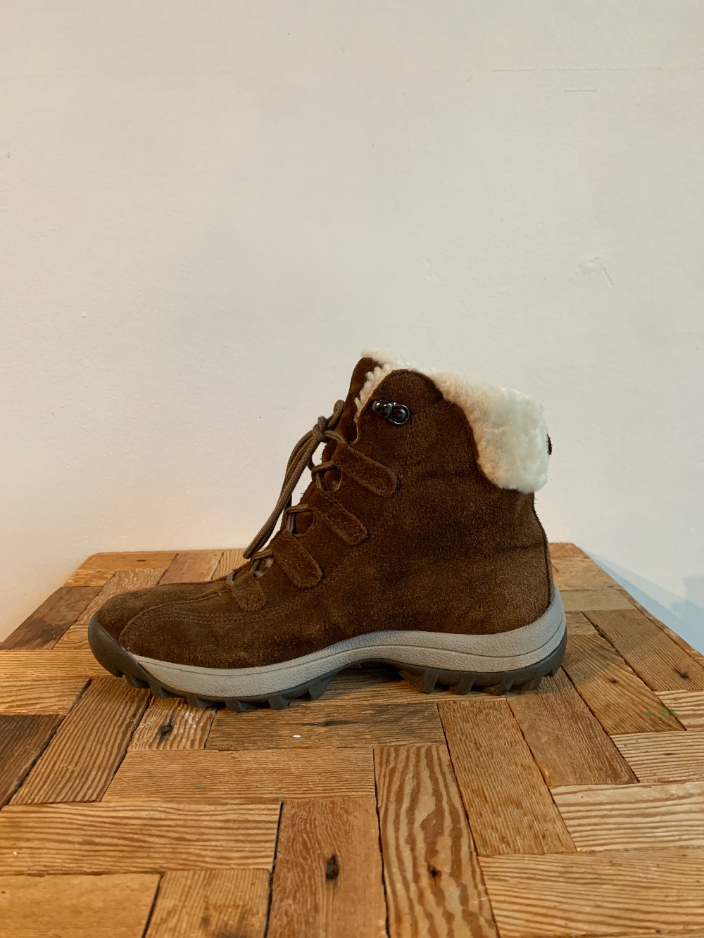 “Premium full-grain waterproof leather from a silver-rated tannery provides comfort, durability and keeps feet dry. Waterproof membrane keeps feet dry and comfortable for protection in any weather. Faux shearling lining in collar and tongue for warmth and comfort. 100% recycled PET mesh lining and footbed cover made from recycled plastic bottles is comfortable, breathable and environmentally conscious. Compression-molded EVA midsole provides lightweight cushioning and shock absorption for all-day comfort. Nylon shank for arch support. Durable rubber lug outsole for traction.”