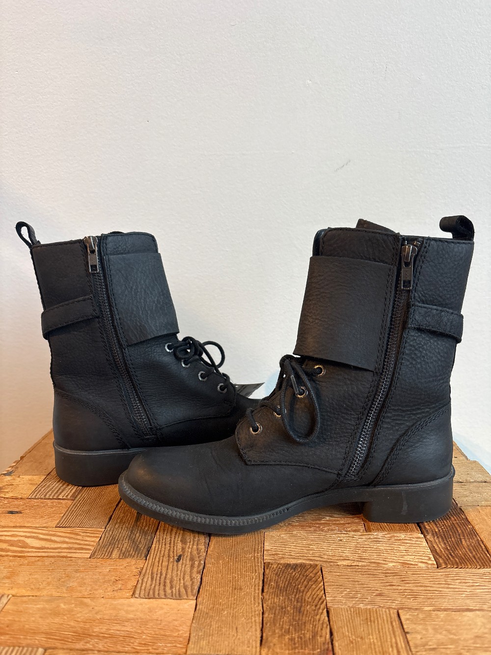 Like new condition! “Side-zip leather boot. Crafted in premium waterproof leather that’s been seam-sealed and backed with a waterproof membrane, you can ignore the forecast and head out. The wrap-around leather cuff and metal buckle are more than just design elements: they add durability and dependability.”