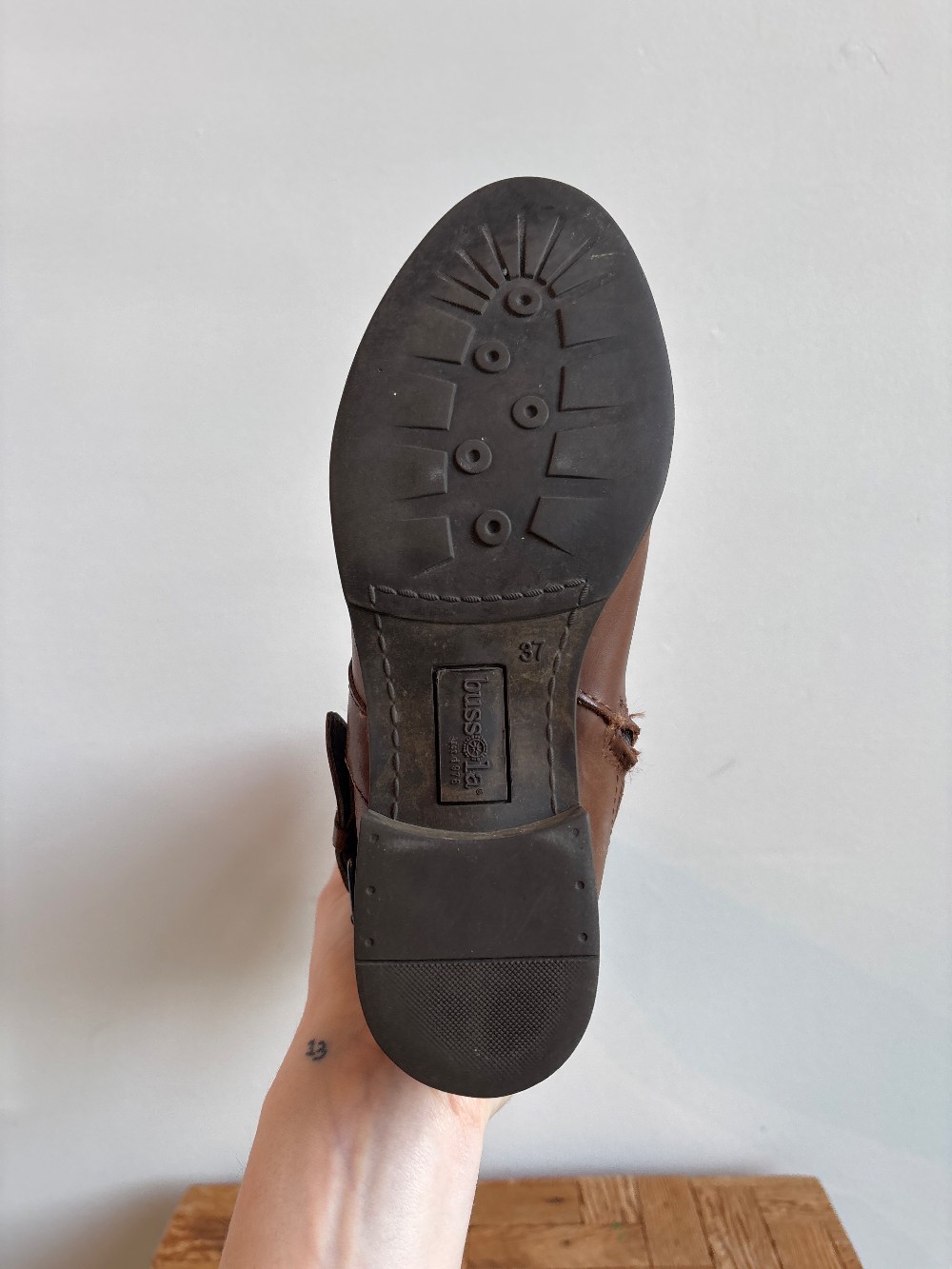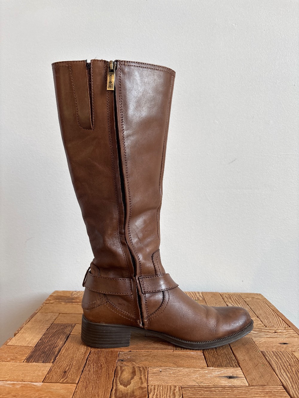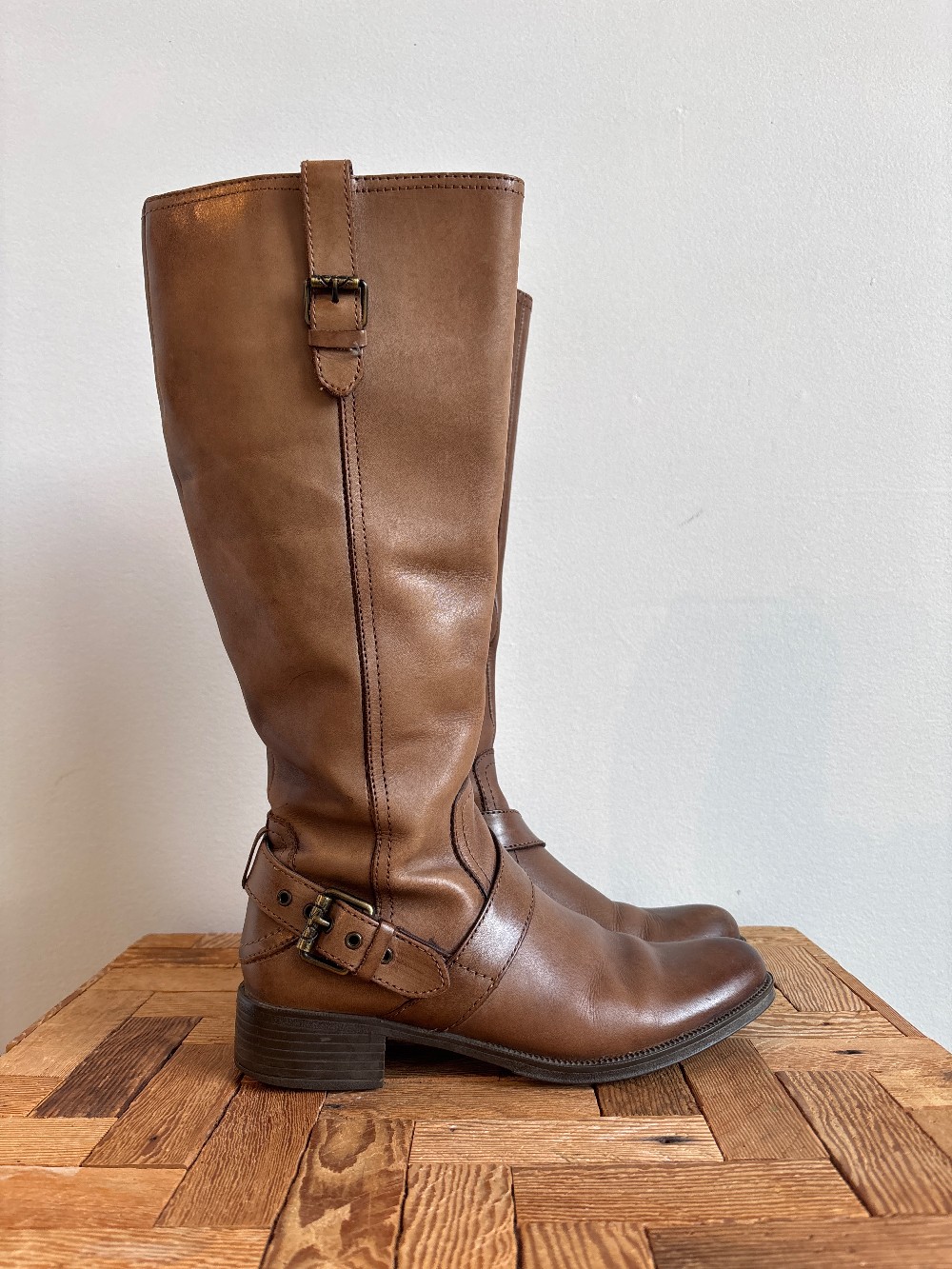 AS IS: discolouration around the toes. A sleek leather tall boot with harness buckle sides and a block heel. Features black insulated lining for warmth and a rounded toe.