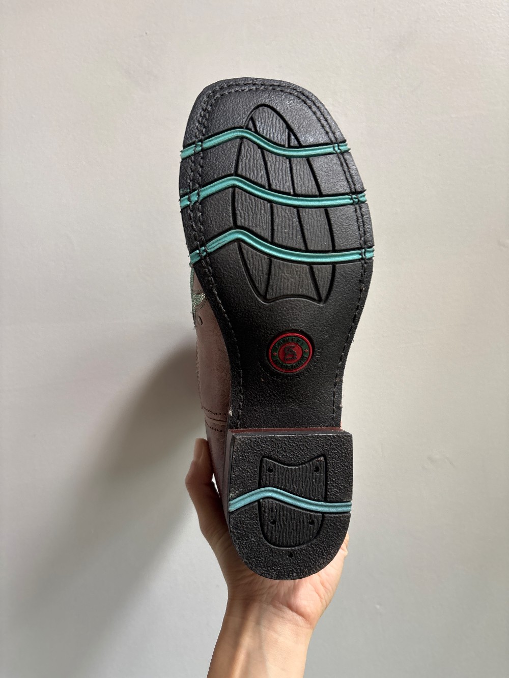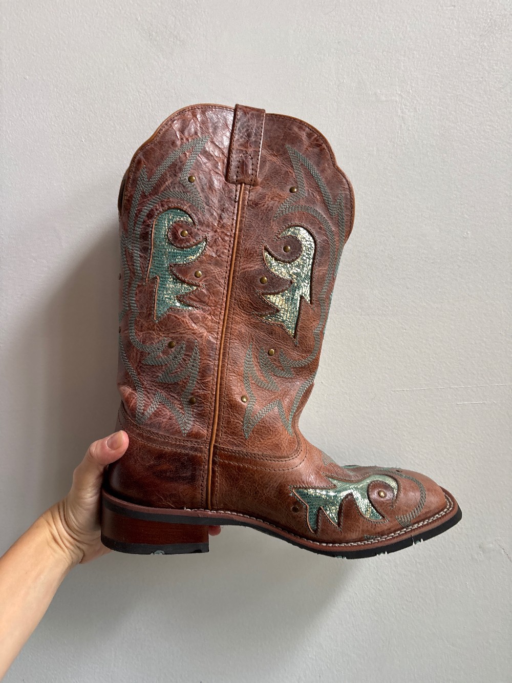 Brand new condition! “Made with premium leather, this boot glimmers with silver underlays and brass studs. Classic western stitching in turquoise. Comes with a Removable Orthotic insole, and Cowboy Approved II outsole.”