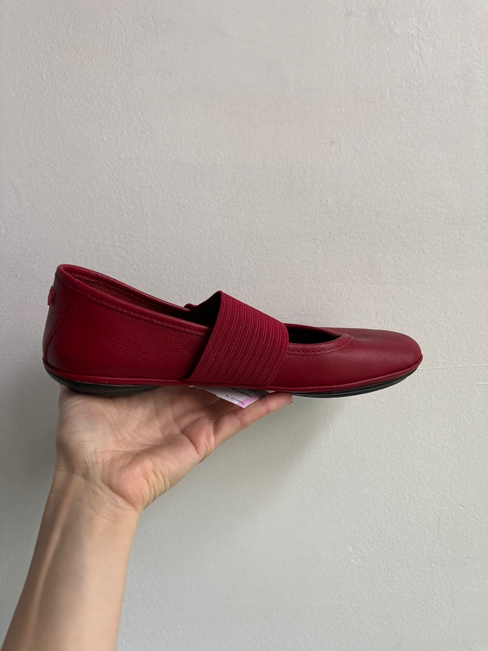 Red calfskin ballerinas with removable EVA footbeds and rubber outsoles (20% recycled).