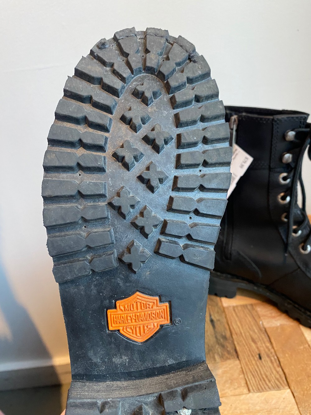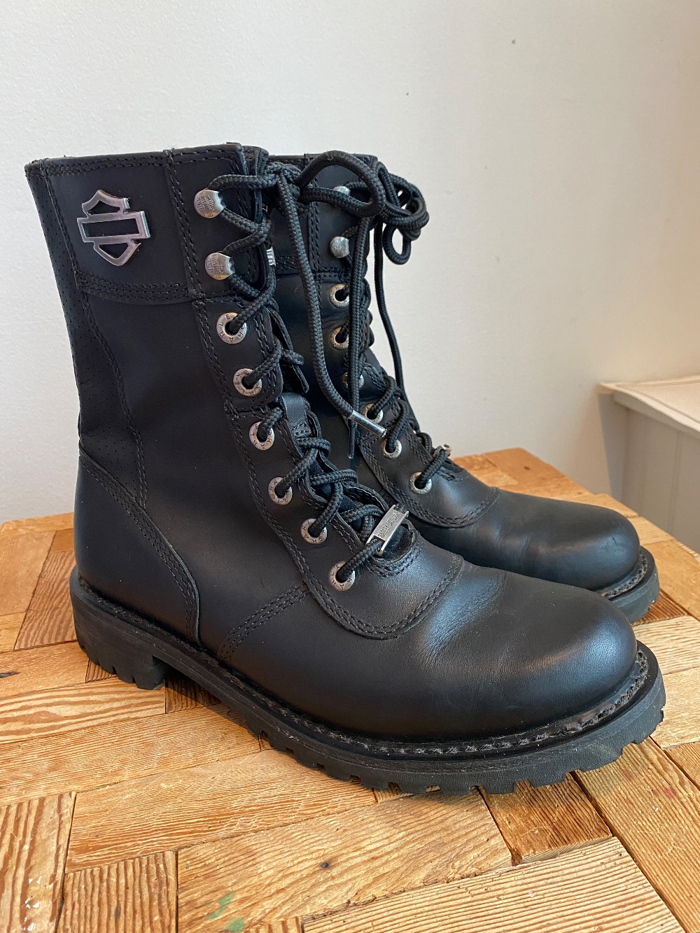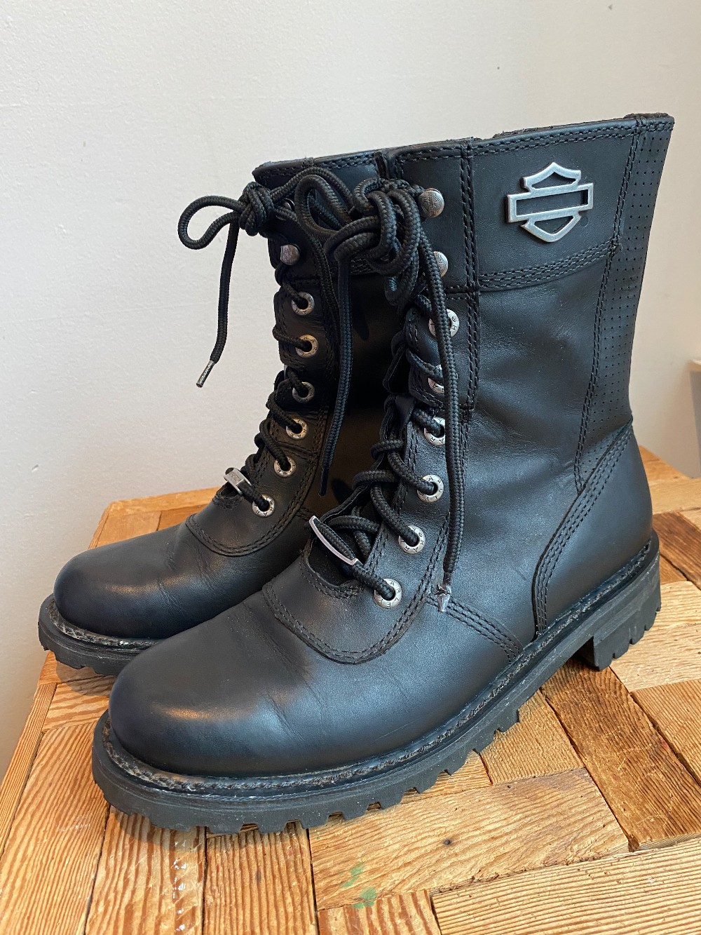Harley-Davidson® full grain leather and perforated leather upper. Full length cushion sock lining. Shaft height: 8.0; Heel height: 1.5. YKK(R) locking inside zipper. Rubber mini lug outsole. Goodyear(R) welt construction.