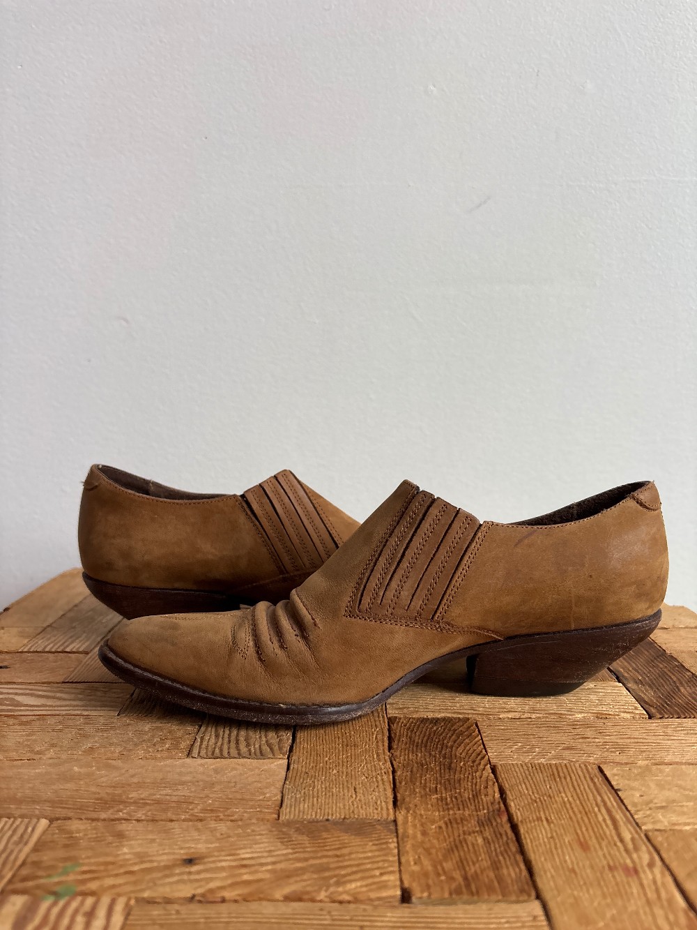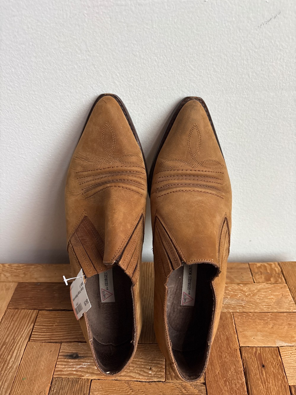 AS IS: Vintage condition - Vintage Guess leather ankle boots with a stunning pointed toe detail and subtle heel silhouette. Slip on style.