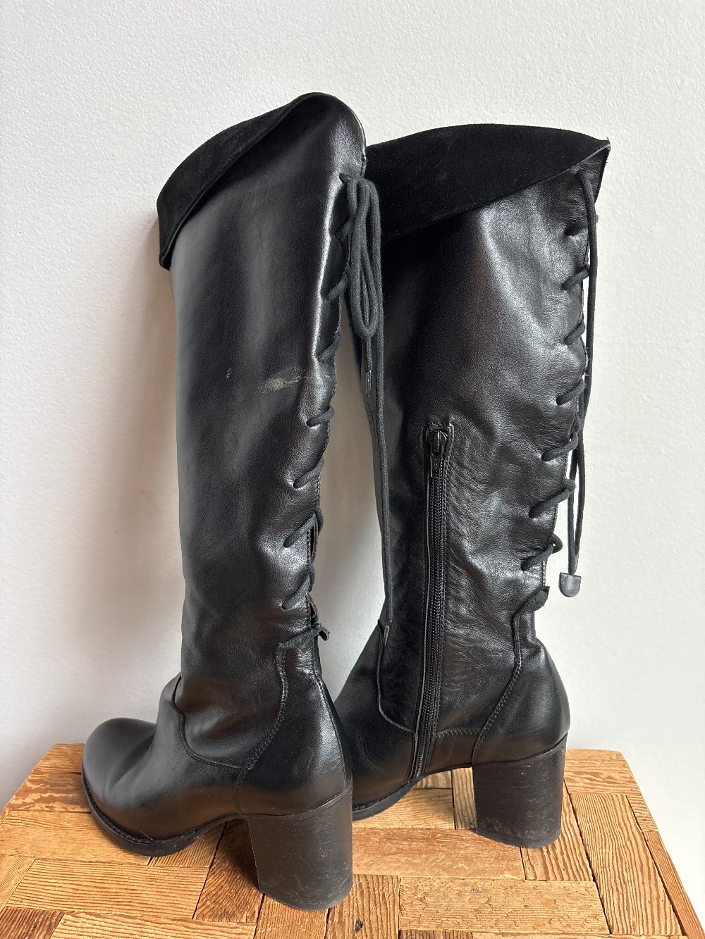 Stunning Italian made heeled leather boots with a lace up detail at the back and side zipper closure