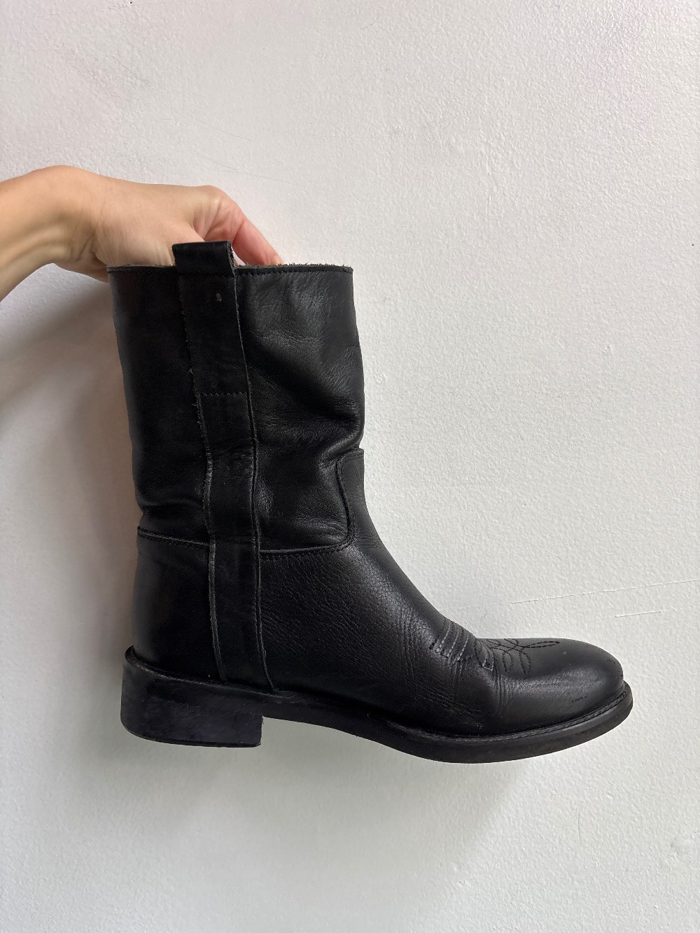 Soft leather boots with a round toe and durable outsole. Has side pull tabs for easy on and off.