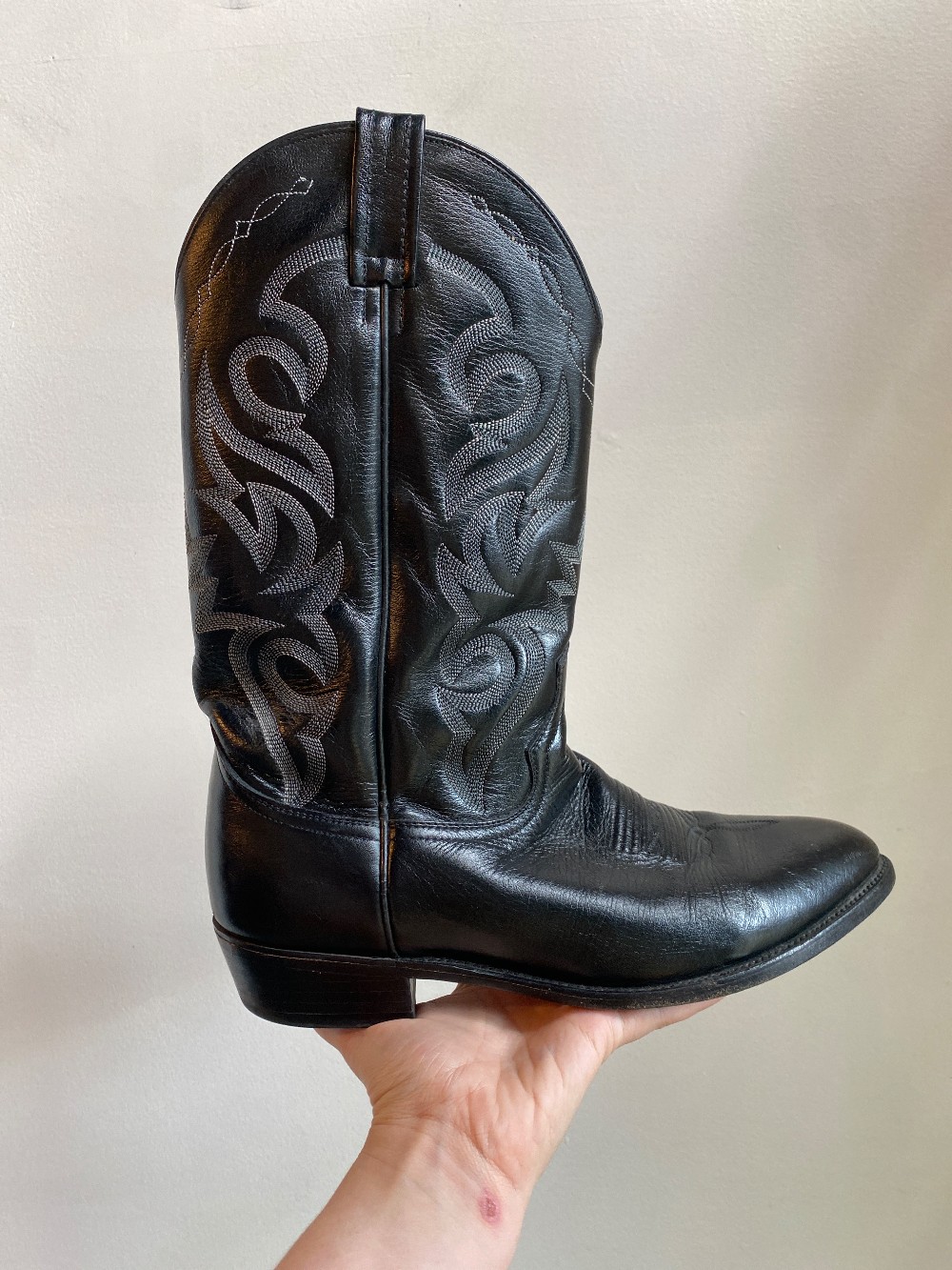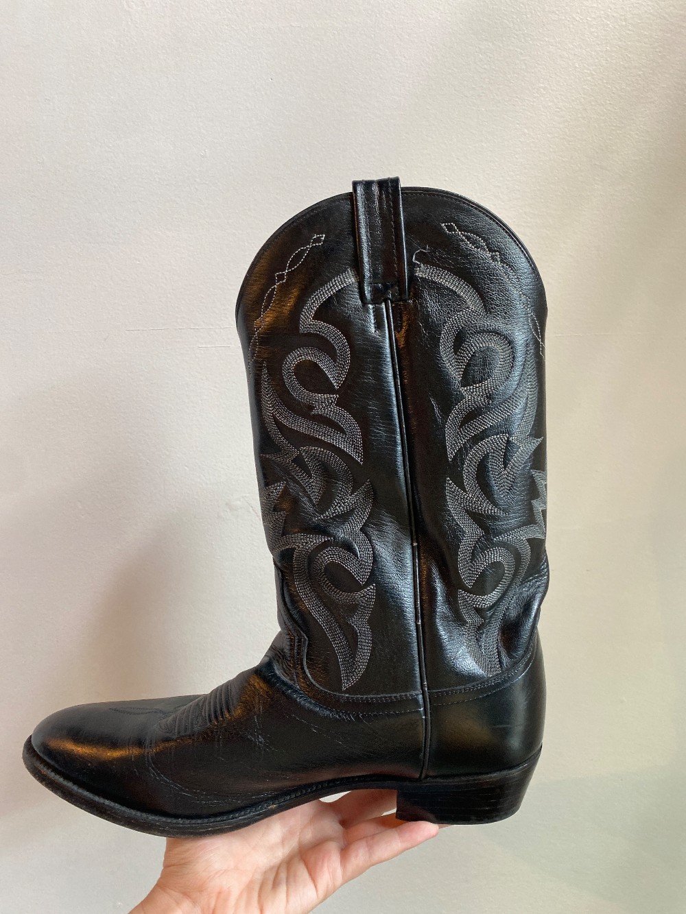 Pristine mens cowboy boots in black leather with a pointed toe and embroidery on the toe and boot part.