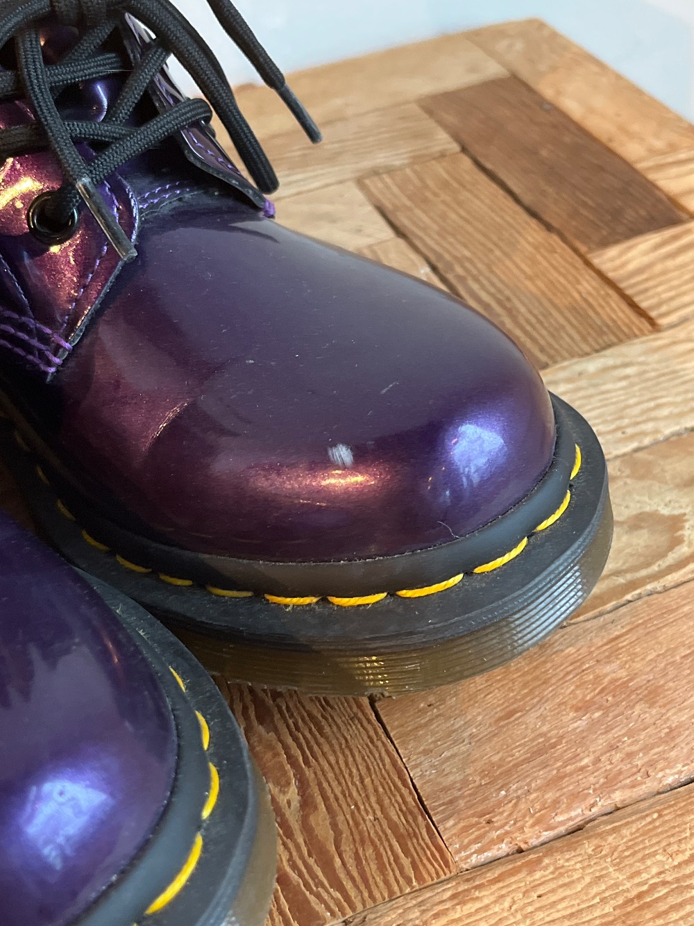 AS IS: Minor Scuffs on toes - Metallic-like purple vegan boots with a lace up styling and rubber sole.