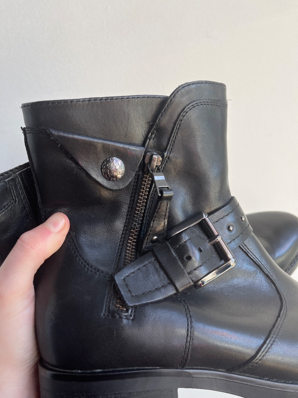 Round slightly pointed Toe ankle height boots with a side zip closure, stud harness detailing and subtle heel.
