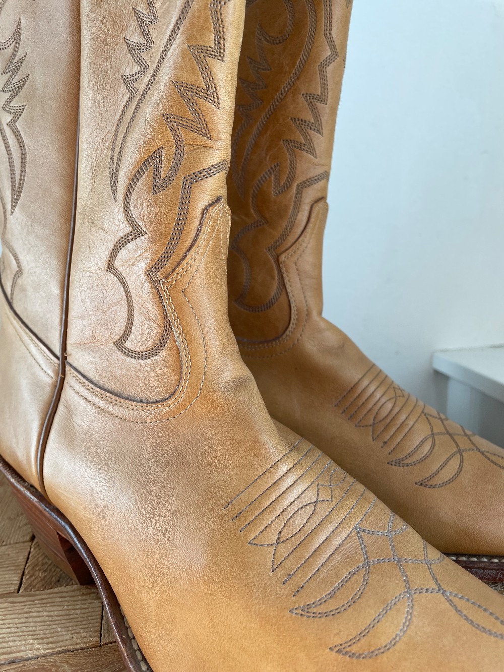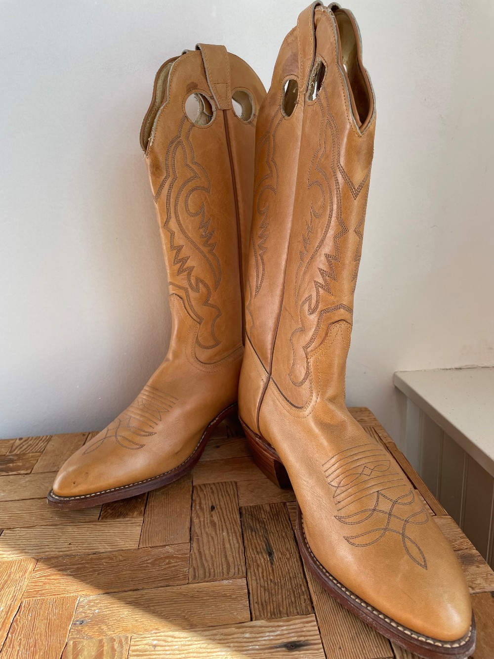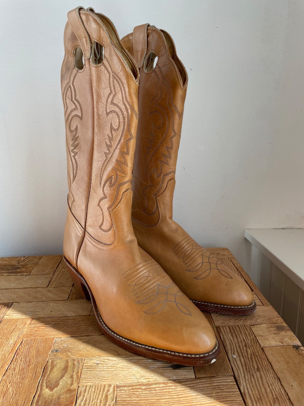 Men’s sizing! 7.5mens similar to 9/9.5 womens. AS IS: Some small visible marks but overall in great condition. camel toned warm leather cowboy boot with brown and cream embroidery along the toe and leg. Features pull tabs, wooden soles, and a 2 inch heel.